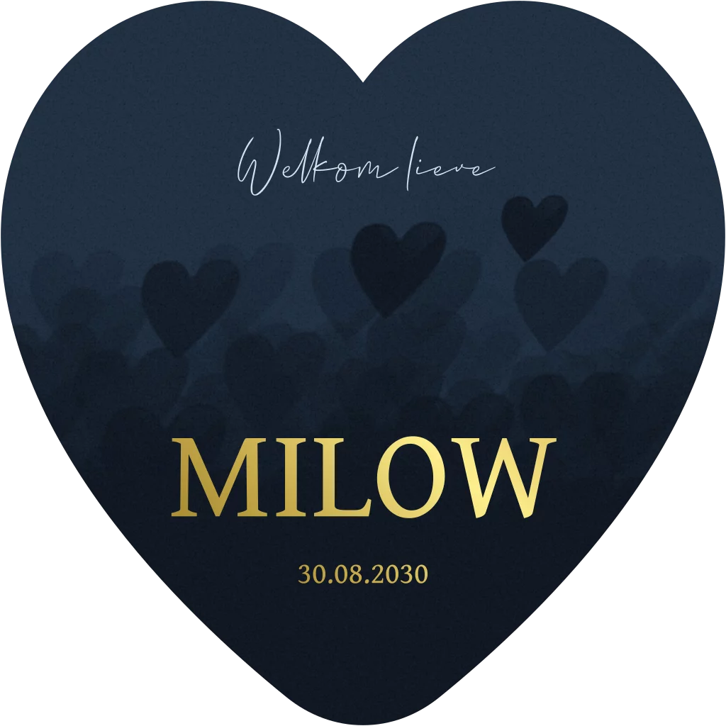 Uniek geboortekaartje voor een jongen in de vorm van een hart. Met een hartjes achtergrond in donkerblauw met goudfolie.