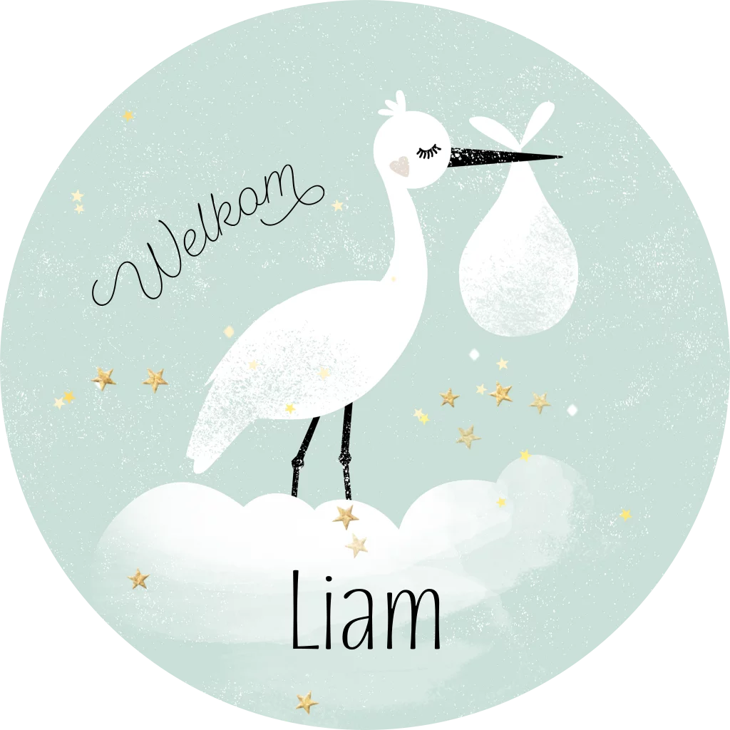 Een mooi speciaal geboortekaartje in een ronde vorm met een leuke ooievaar op een mint groene ondergrond.