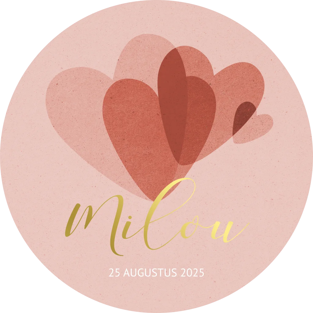 Een bijzonder en hip geboortekaartje met retro hippe hartjes in roze tinten, een luxe goudfolie naam en een uitgesneden ronde vorm. Een echte verrassing voor de ontvangers!