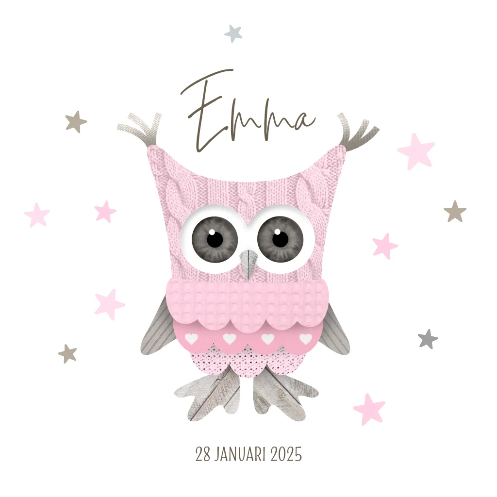 Een bijzonder lief geboortekaartje met een kleine roze uil in een ronde vorm.