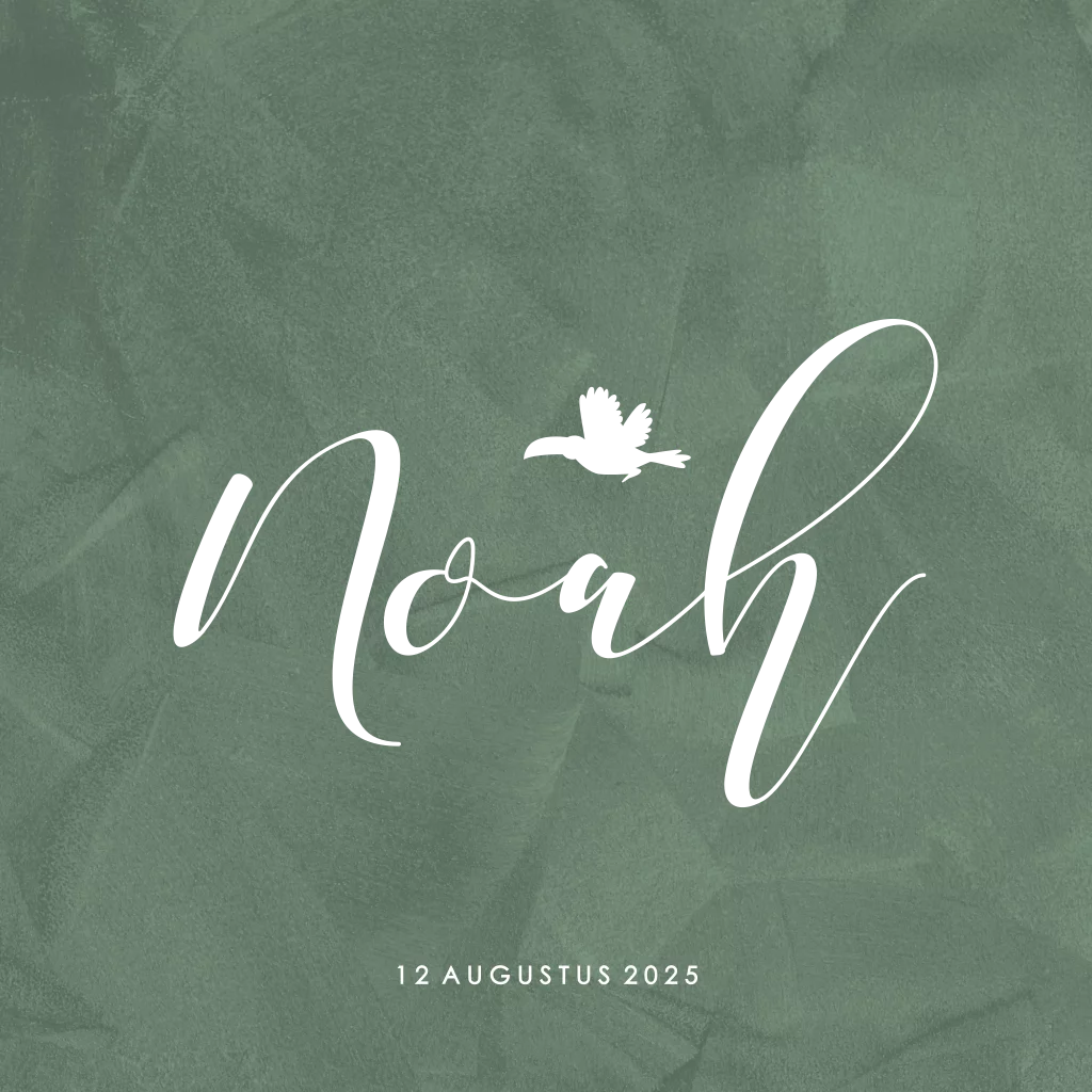 Stoer geboortekaartje met donker groene jungle look ondergrond en groot de naam van jullie pasgeboren jongen in zwarte hoogglans . Met een silhouet van een toekan vogel ook in zwarte hoogglans druk.