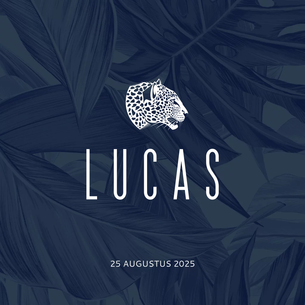 Stoer geboortekaartje voor je pasgeboren zoon met een goudfolie panter en goudfolie naam op een donkerblauwe jungle bladeren ondergrond.