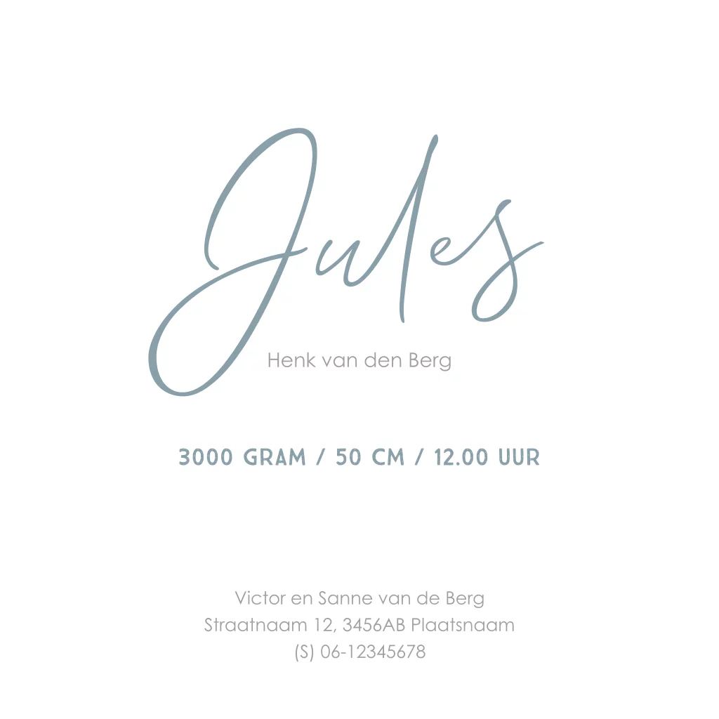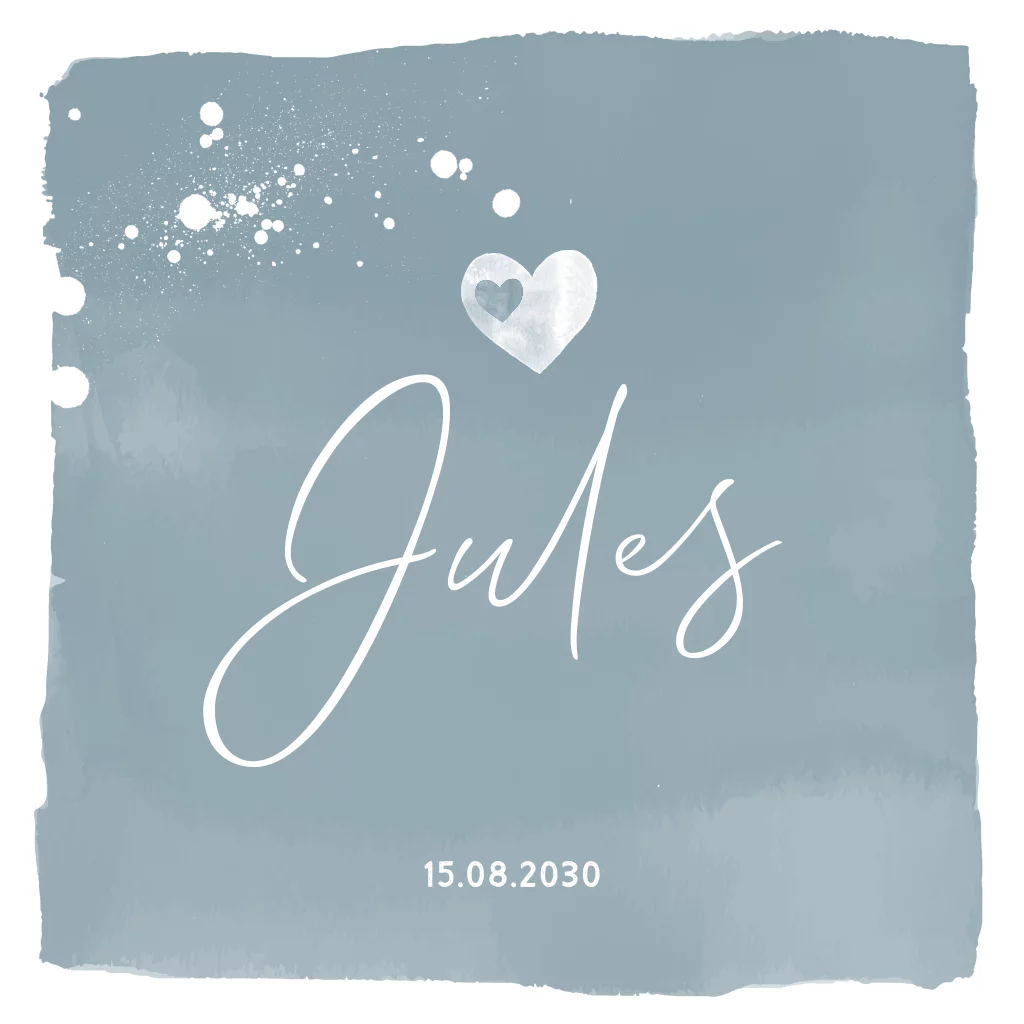 Minimalistisch mooi blauwe geboortekaartje, perfect voor jullie kleine jongen! De achtergrond in grijs met blauwe tinten geeft het een rustige sfeer, terwijl in wit groot naam van jullie kleintje in het midden staat met een lief hartje en rondom speelse verfspetters.