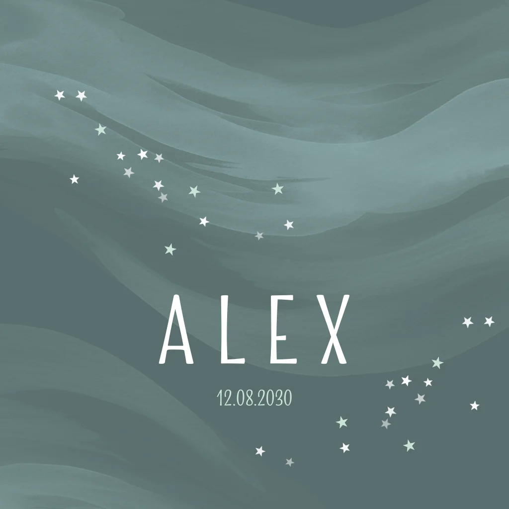 Een chique geboortekaartje met een petrol groene ondergrond en witte waterverf golven, versierd met schattige sterretjes. Dit stijlvolle en minimalistische geboortekaartje voor een jongen straalt een chique uitstraling uit, perfect om de komst van jullie kleintje aan te kondigen. Personaliseer met naam en datum en maak zelf het mooiste geboortekaartje bij Luckz.