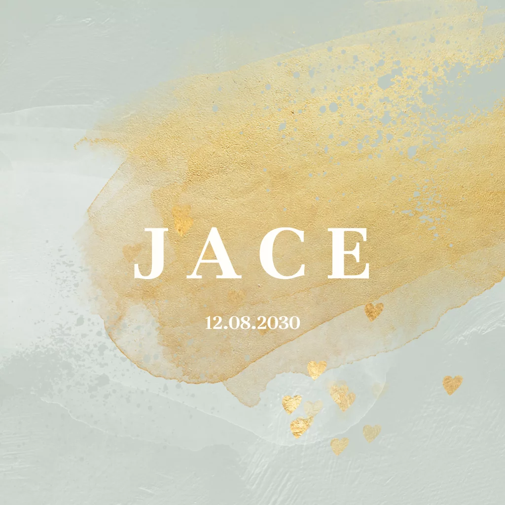 Wat een mooi en chique geboortekaartje! Met een hippe blauwgrijze achtergrond met daarop grote gouden verfvegen en kleine hartjes. In het midden straalt groot de naam van jouw kleintje op het geboortekaartje. Pas alles naar wens aan. (geen echt goudinkt).