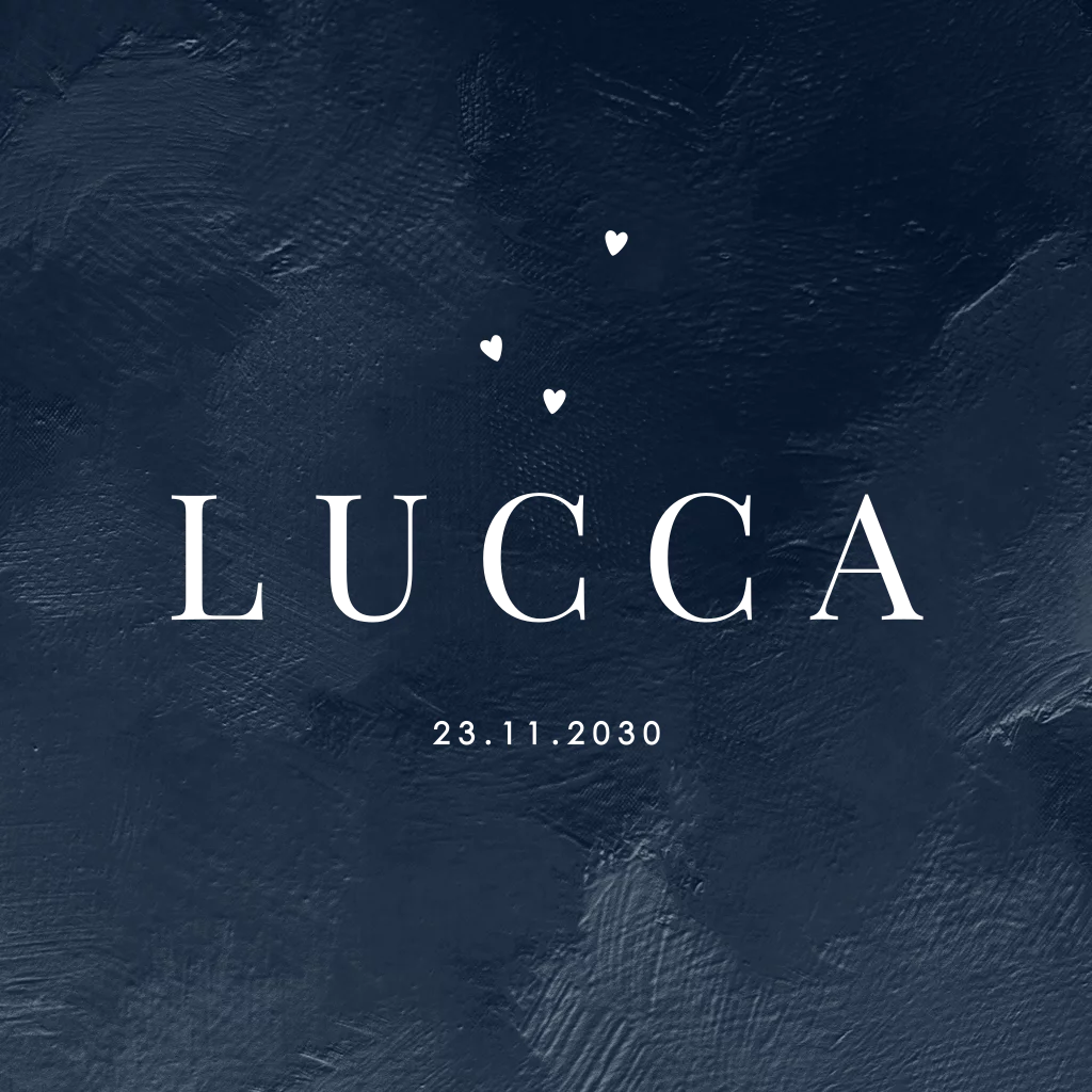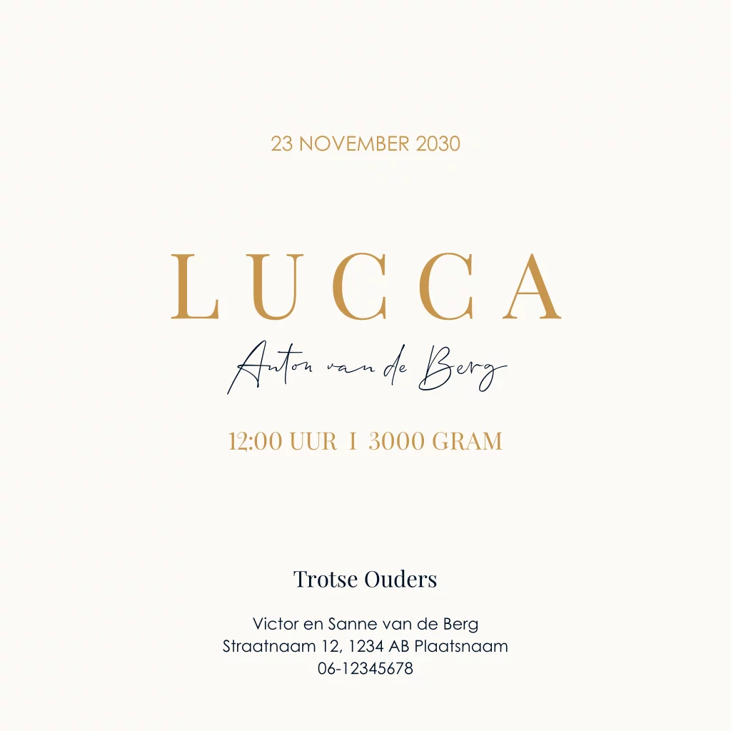 Dit chique geboortekaartje voor een jongen straalt luxe uit, ideaal voor ouders die streven naar een minimalistisch en stijlvol ontwerp. Met een diepe donker blauwe ondergrond en de naam groot in glinsterende goudfolie. Laat de wereld weten dat jullie zoontje is geboren met dit prachtige en stijlvolle geboortekaartje.