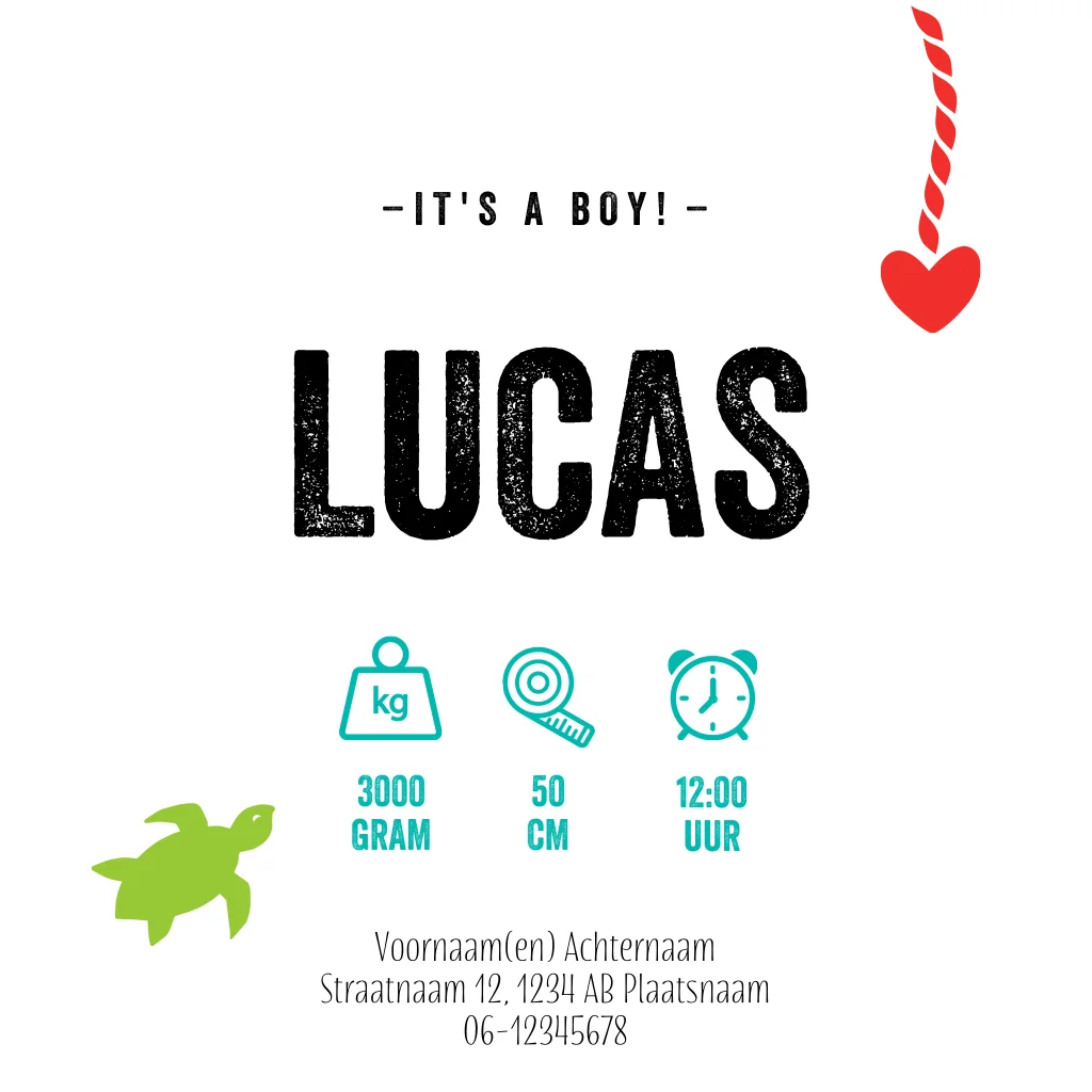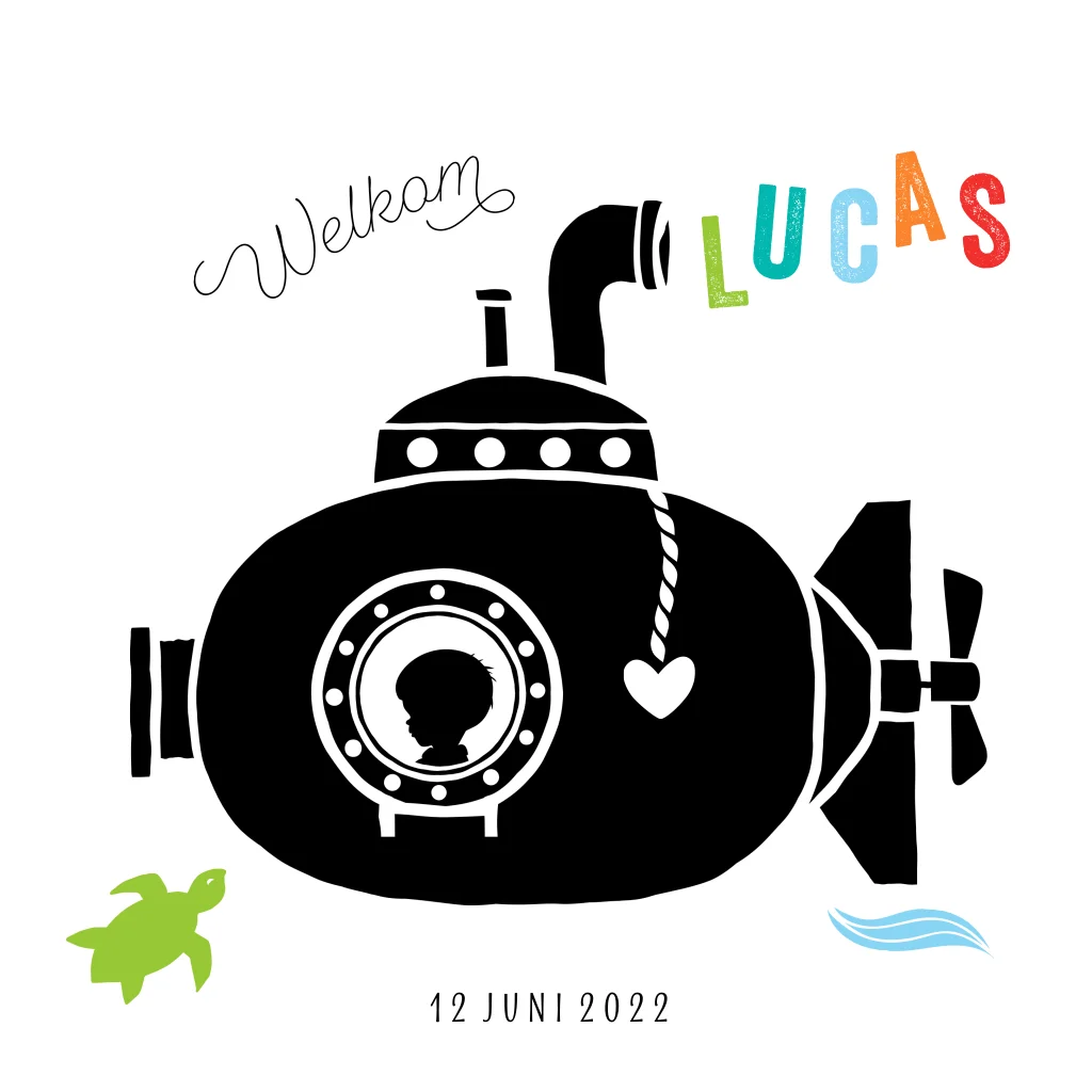 Origineel, in silhouet geïllustreerd geboortekaartje van een onderzeeër met schildpadje. De illustratie is in zwart-wit met vrolijke kleuraccenten. Alle kleuren en geboorteteksten zijn eenvoudig online aan te passen. De leukste geboortekaartjes ontwerp je zelf bij Luckz.