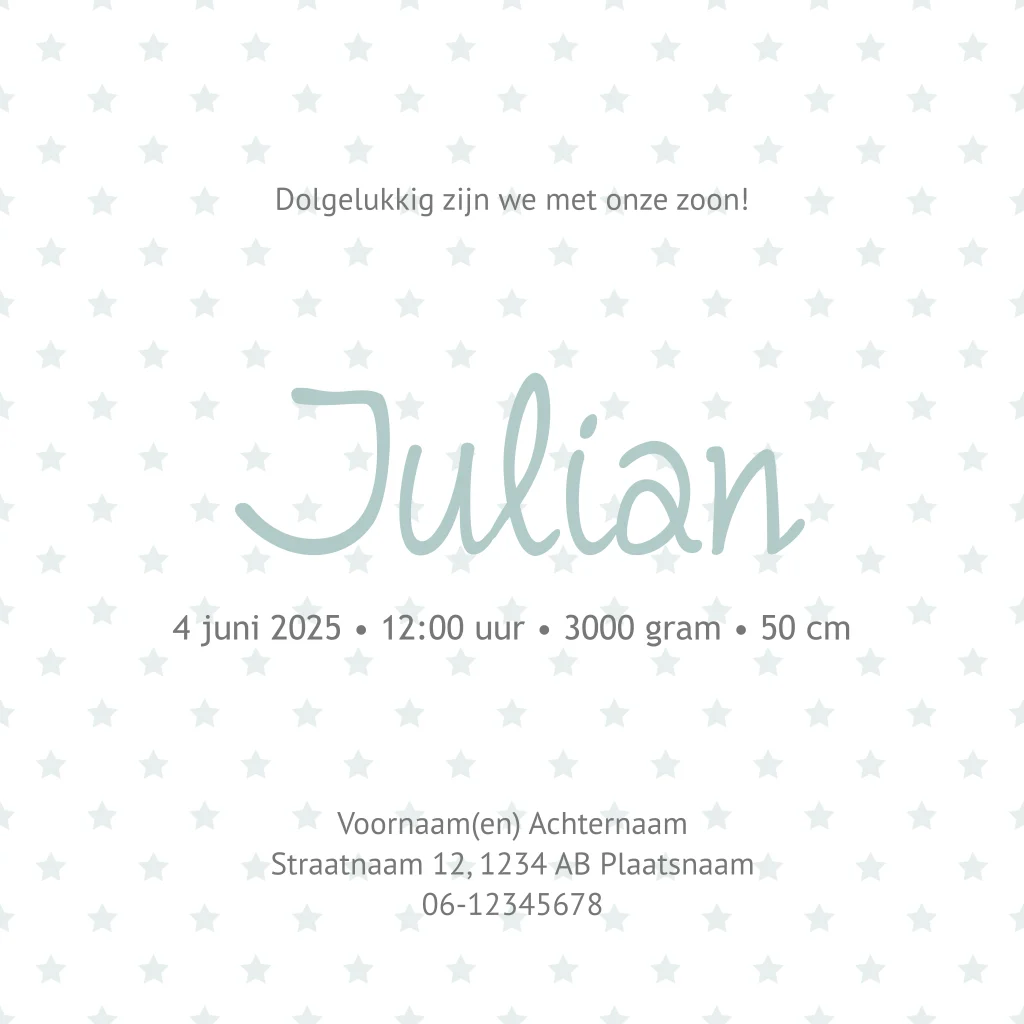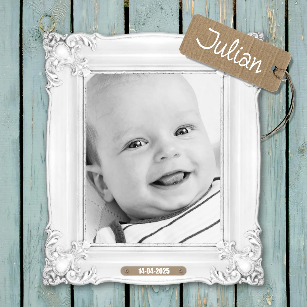 Dit hippe geboortekaartje heeft een stoer mint houtkleurige achtergrond met daarop een wit white wash fotolijstje met een foto van de pasgeboren kanjer en een kartonnen labeltje met daarop de naam. De foto is gemakkelijk aan te passen met jouw persoonlijke foto. De binnenkant heeft ook een fotolijstje met steigerhouten achtergrond waarin je een origineel geboortegedichtje kan schrijven.