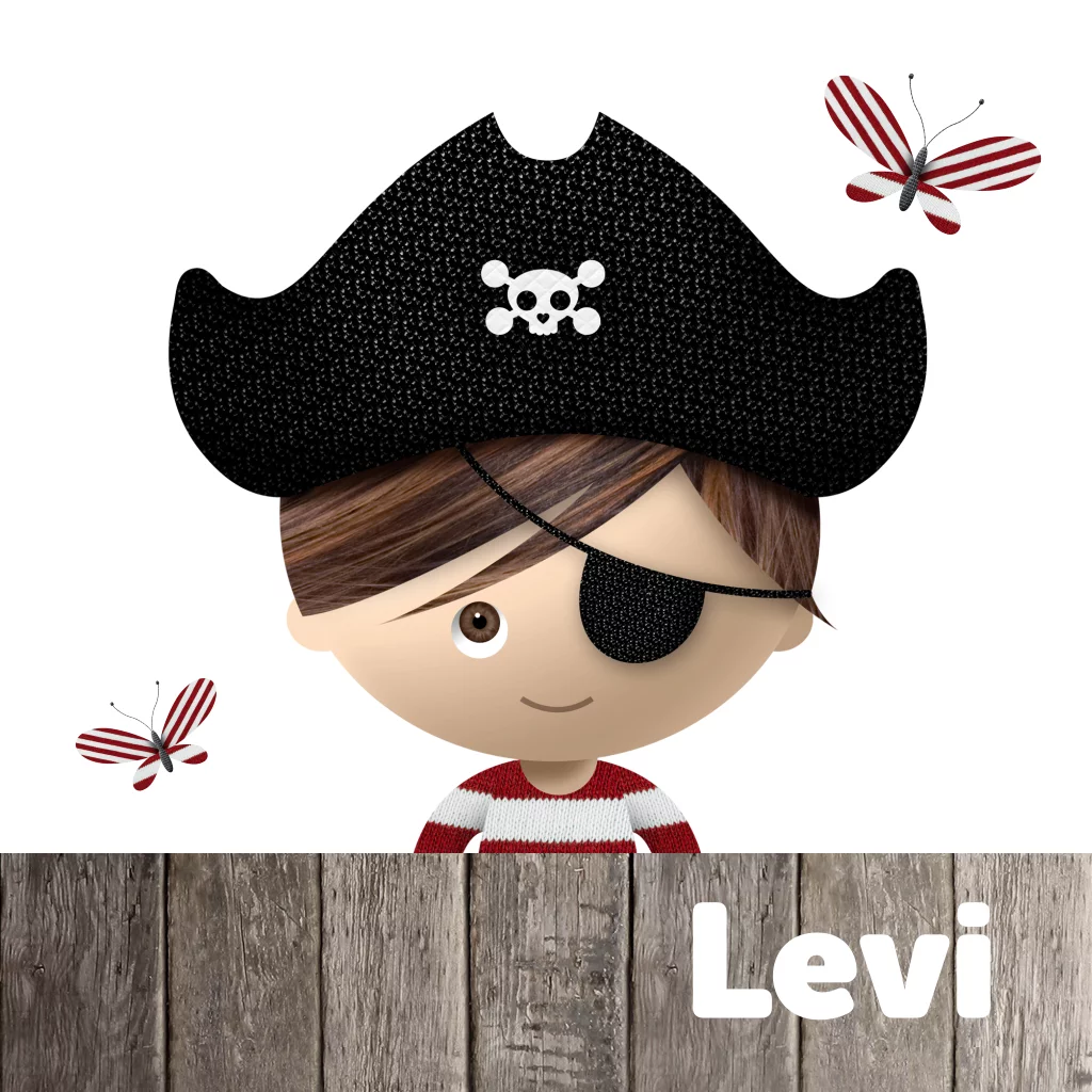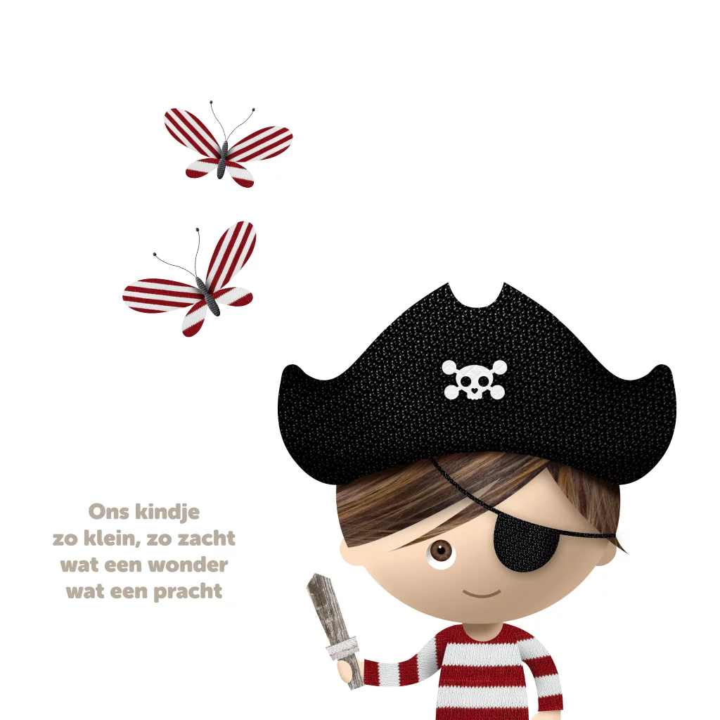 De piraat kijkt uit over een steigerhouten schutting. Om hem heen vliegen leuke rood-witte gestreepte vlindertjes. De linker binnenkant van de kaart is volledig van steigerhout met een vlinder en plaats voor zijn naam. De linkerkant heeft plaats voor geboorte informatie van je nieuwe aanwinst. De tekst op de kaart is aan te passen.