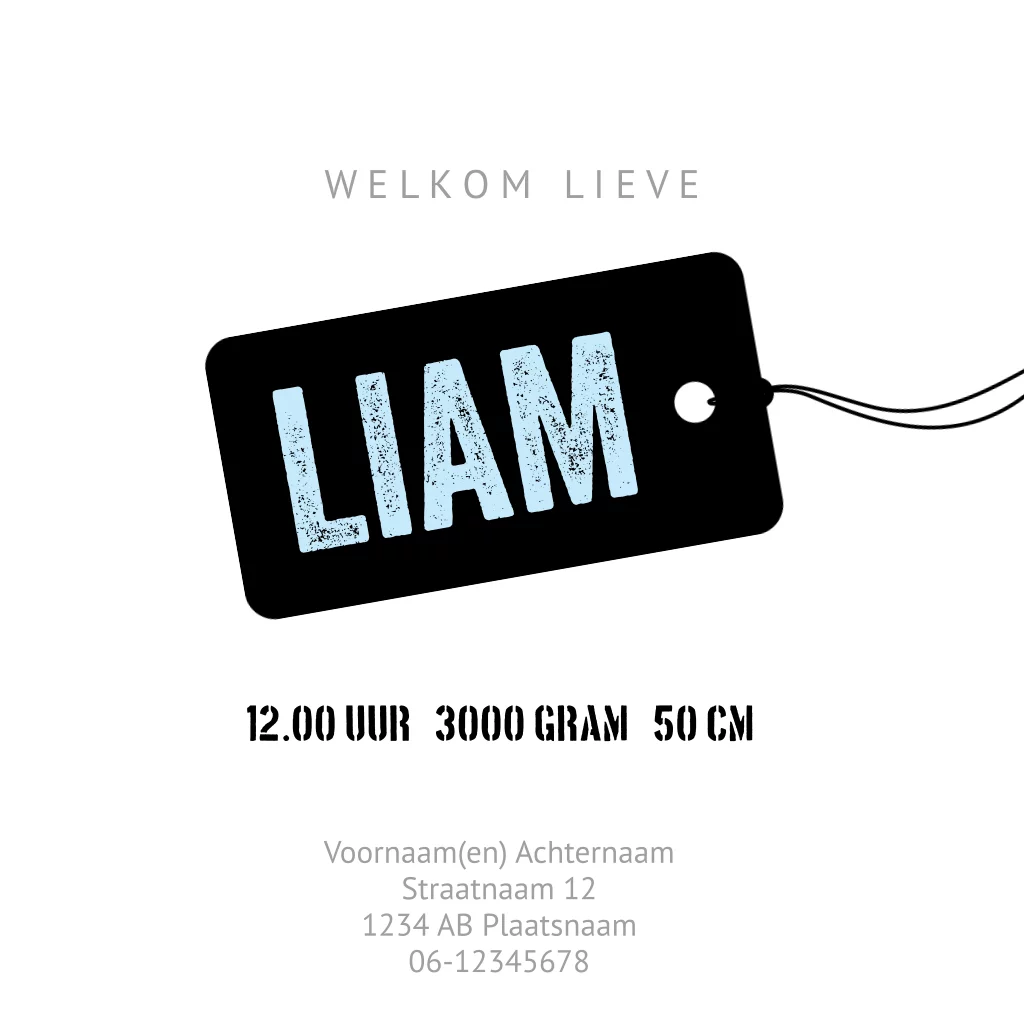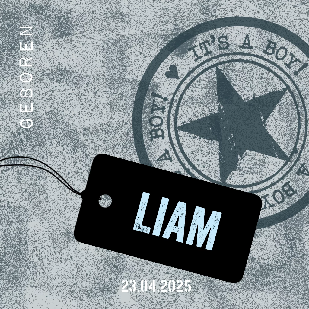 Stoer geboortekaartje voor een jongen met stempel en label die je zelf kan personaliseren bij Luckz.