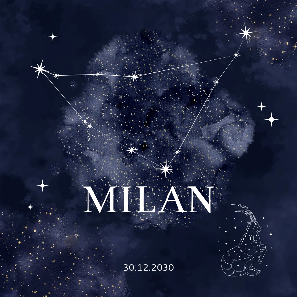 Dit prachtige geboortekaartje is speciaal ontworpen voor het sterrenbeeld Steenbok, met de verwachte geboortedatum tussen 22 december en 20 januari. Ontdek onze uitgebreide selectie van mooie ontwerpen, beschikbaar voor alle sterrenbeelden.