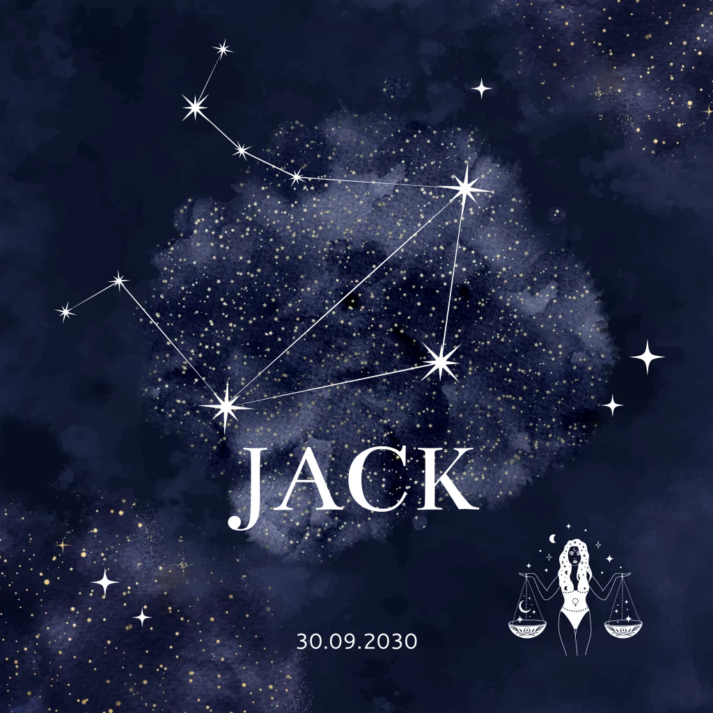 Ontwerp dit luxe en stoere geboortekaartje voor een jongen met het sterrenbeeld Weegschaal! Een chique donkerblauwe achtergrond vol met kleine sterretjes en groot de naam en het sterrenbeeld Weegschaal in luxe goudfolie effecten. Een perfect geboortekaartje voor een jongen. Alles kun je aanpassen naar wens.
