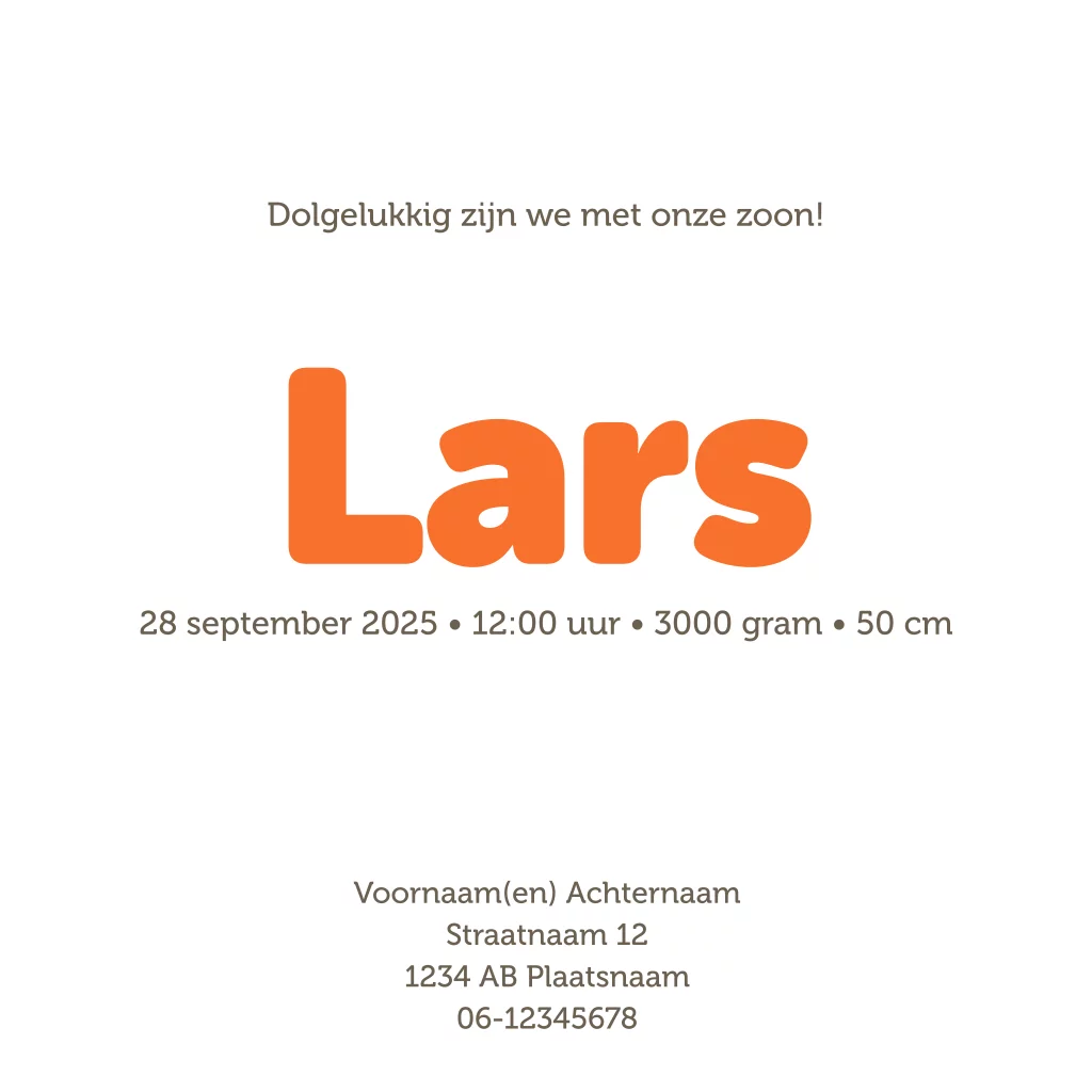 Stoer geboortekaartje met een leuk aapje en een oranje katje. Originele geboortekaartjes van Luckz.