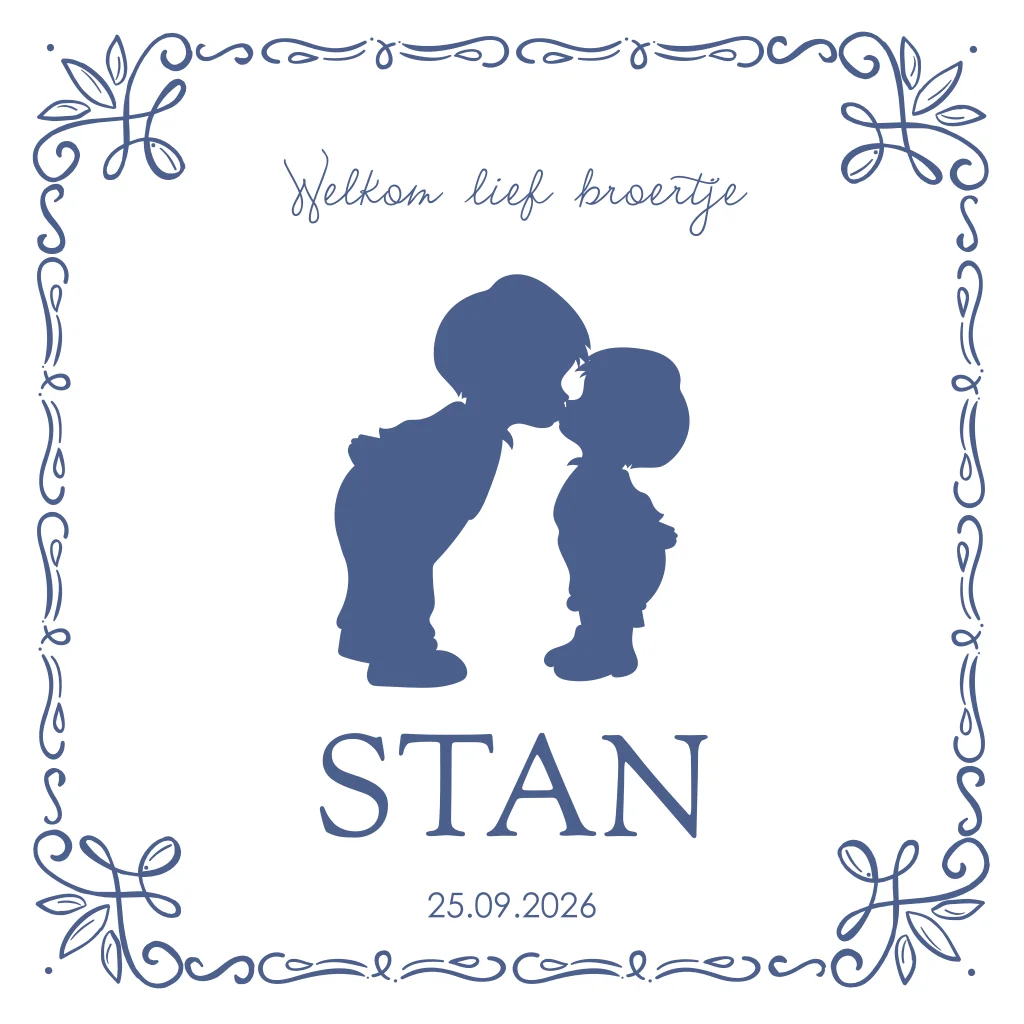 Wat lief! De grote broer geeft zijn kleine broertje een kusje. Een hip geboortekaartje in Delfts blauwe oud-Hollandse stijl met silhouetten van de jongens en rondom klassieke ornamenten. Alles op dit kaartje kun je zelf aanpassen.