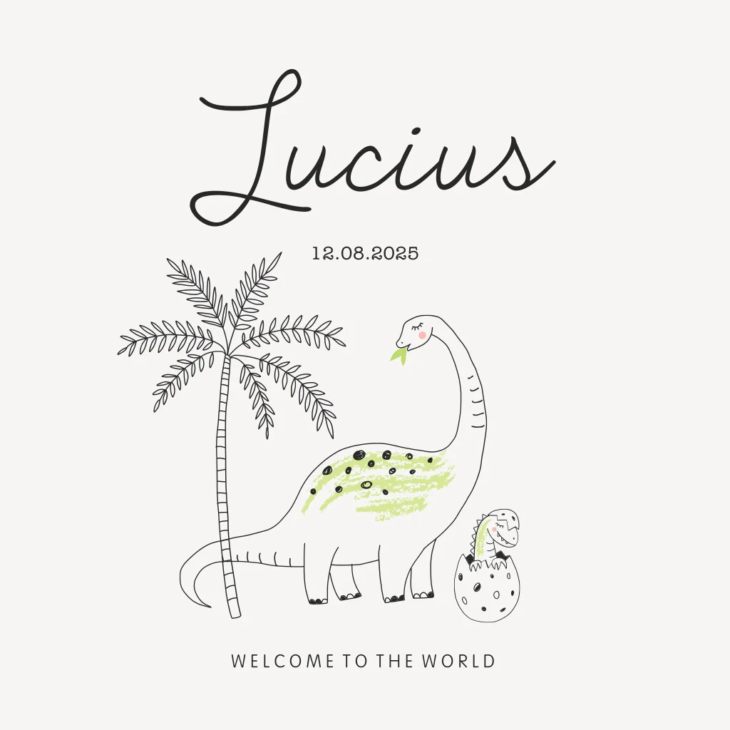 Leuk geboortekaartje met een lieve illustratie van een grote dino en baby dinosaurus die uit een ei komt. met leuke hippe jungle palmboom. Alle teksten, kleuren en elementen kun je zelf gemakkelijk aanpassen met de kaarten editor.