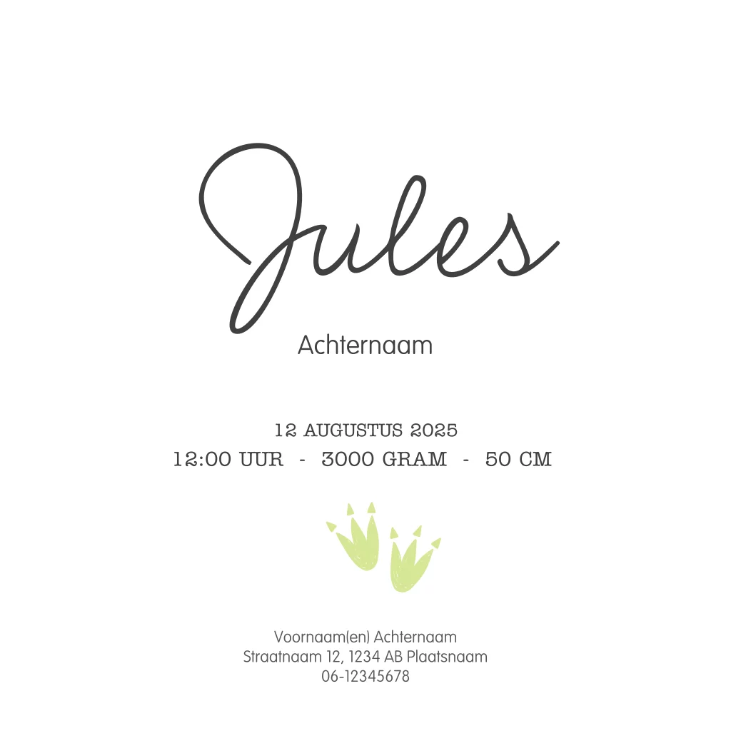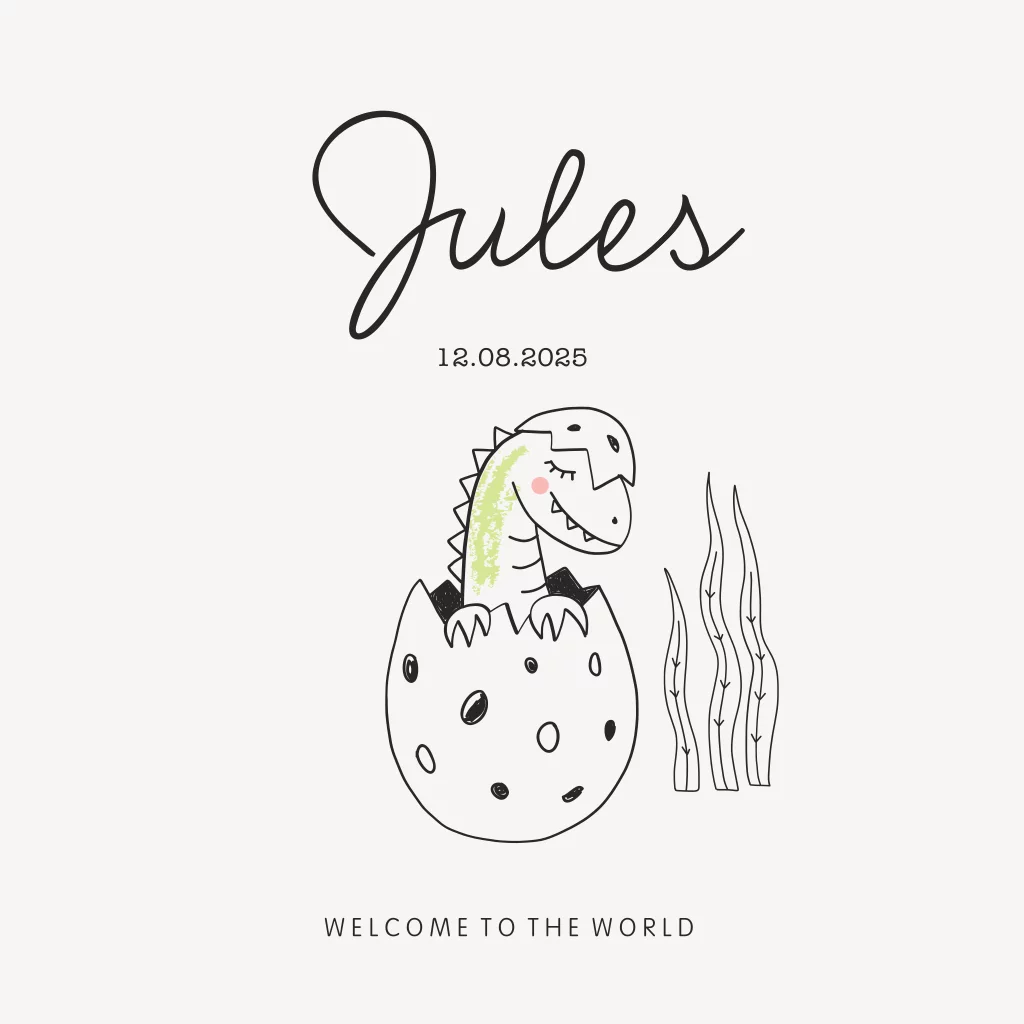 Lief geboortekaartje met een subtiele illustratie van een baby dinosaurus die uit een ei komt, Met lichtgroene tinten in de dinosaurus illustratie en donker grijze lijnen op een lichte ondergrond. Alles op dit leuke geboortekaartje is gemakkelijk aan te passen met onze kaarten editor.