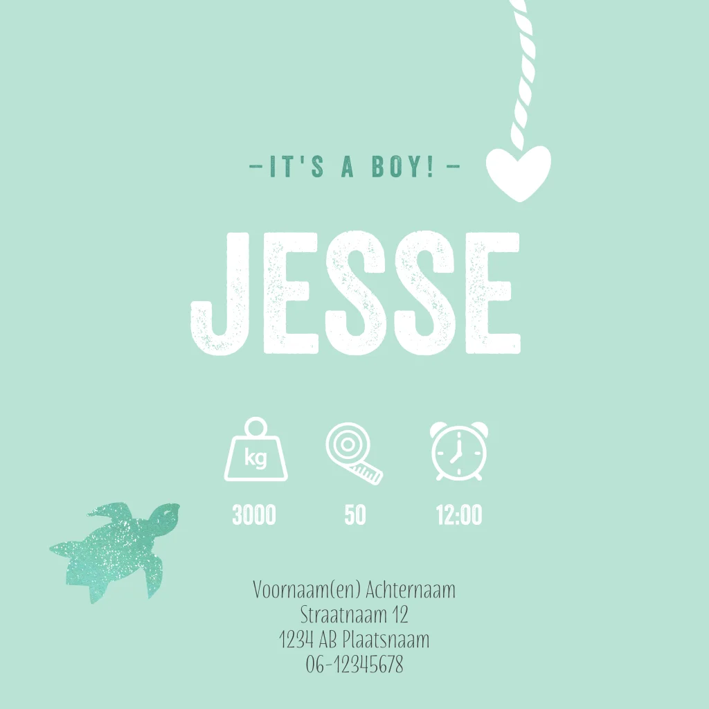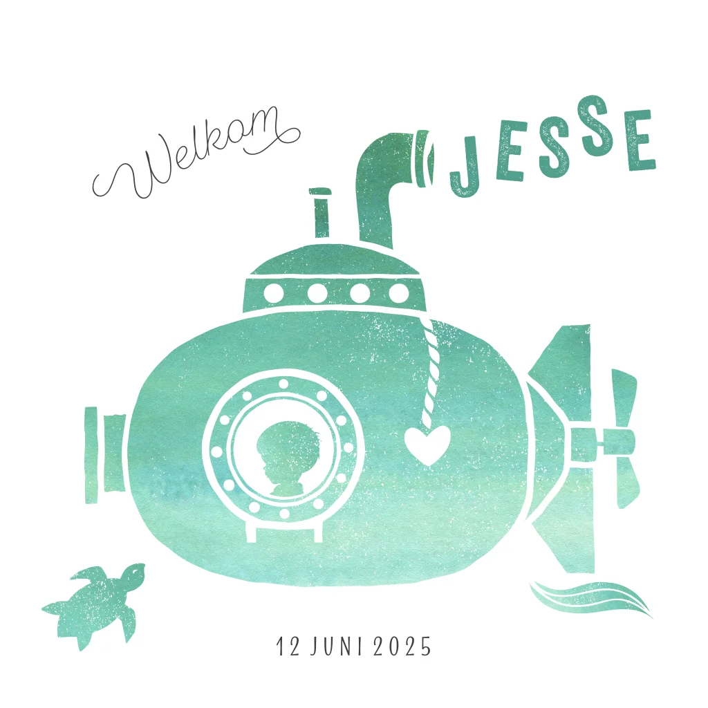 Vrolijk en hip geboortekaartje met een waterverf illustratie van een onderzeeër. In de mint groene duikboot zit in een jongetje.