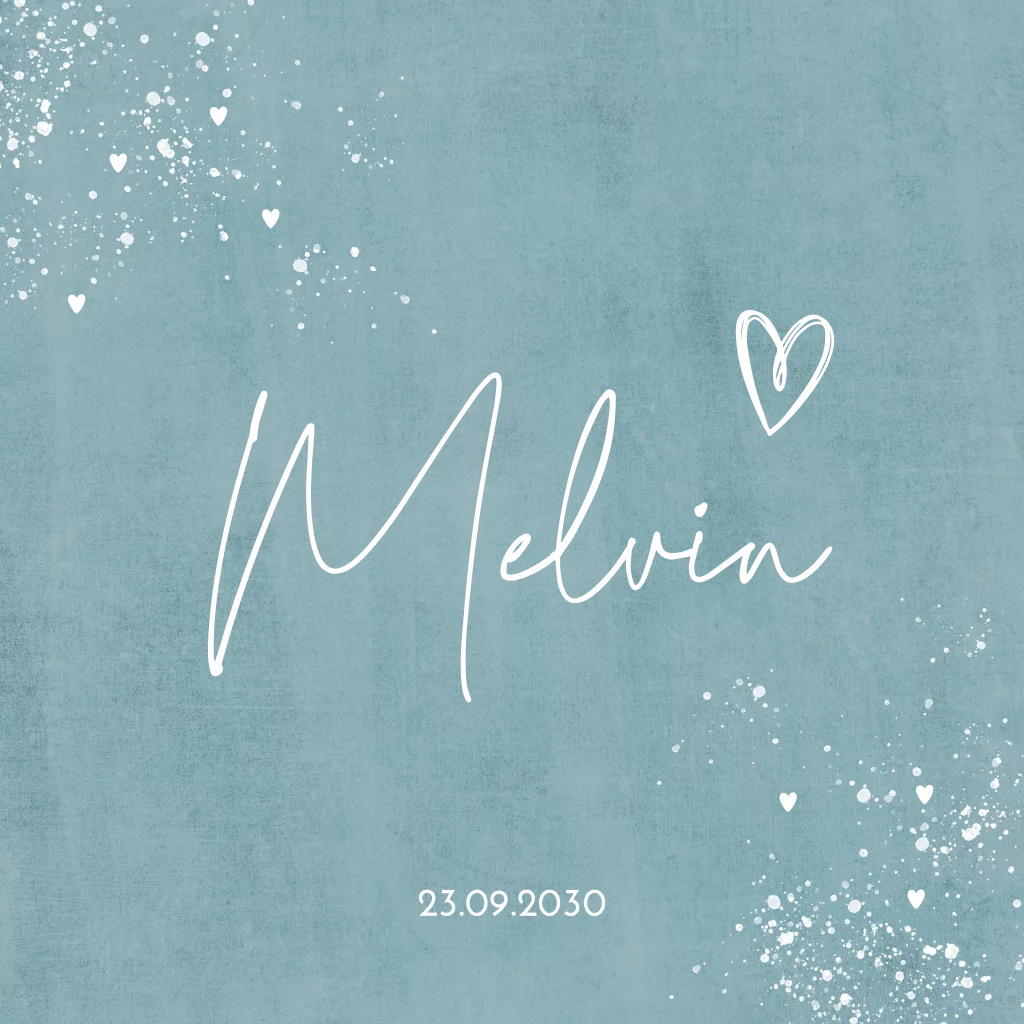 Chique minimalistisch geboortekaartje voor een jongen, met velvet waterverf stijl blauwe achtergrond en witte verfspetters. De naam van jullie kleintje staat groot in echt goudolie samen met een hartje.