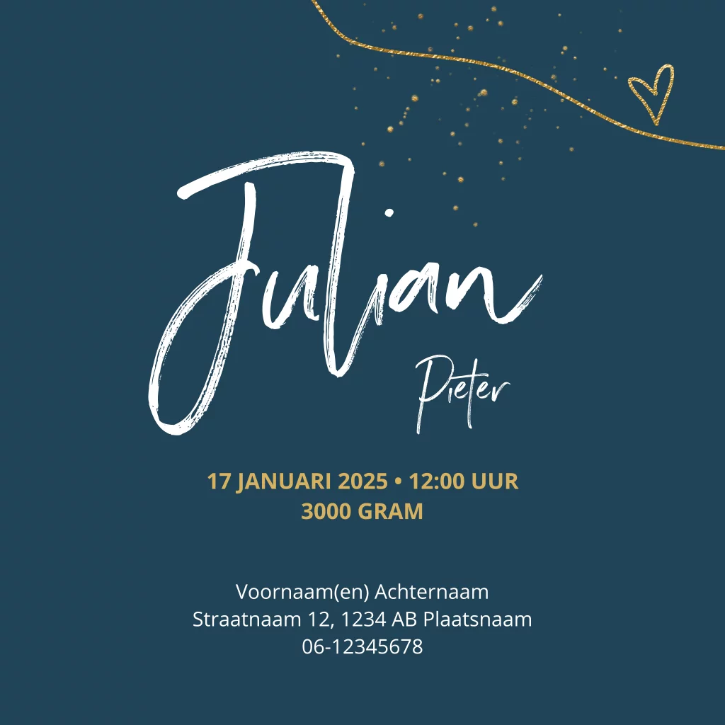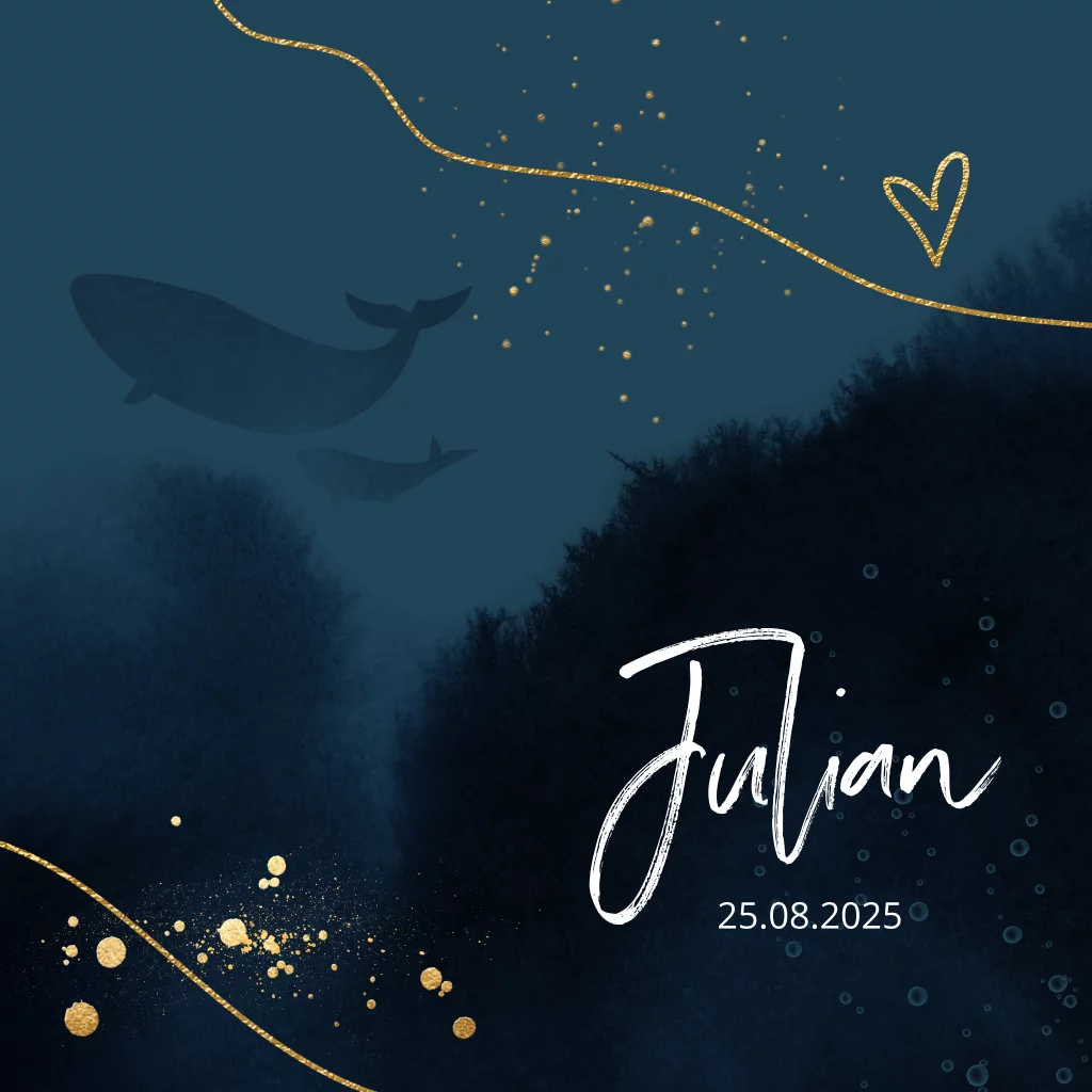 Mooi geboortekaartje voor een jongen met een walvis die onderwater zwemt in een donker blauwe aquarel zee. Met rondom en goud look elementen van sierlijke lijnen, verf spetters en hartjes.