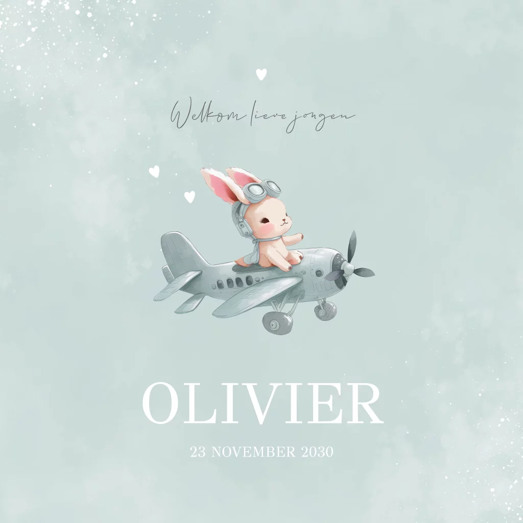Dit lieve geboortekaartje voor een jongen heeft een illustratie van een schattig konijntje dat door de wolken zweeft in zijn eigen vliegtuigje, op een zachte lichtblauwe achtergrond. Dit geboortekaartje is perfect om de komst van jullie kleintje te vieren. Alles kun je zelf eenvoudig personaliseren. Voeg de naam van jullie kleintje toe onder het avontuurlijke konijntje en zet de geboortedatum eronder.