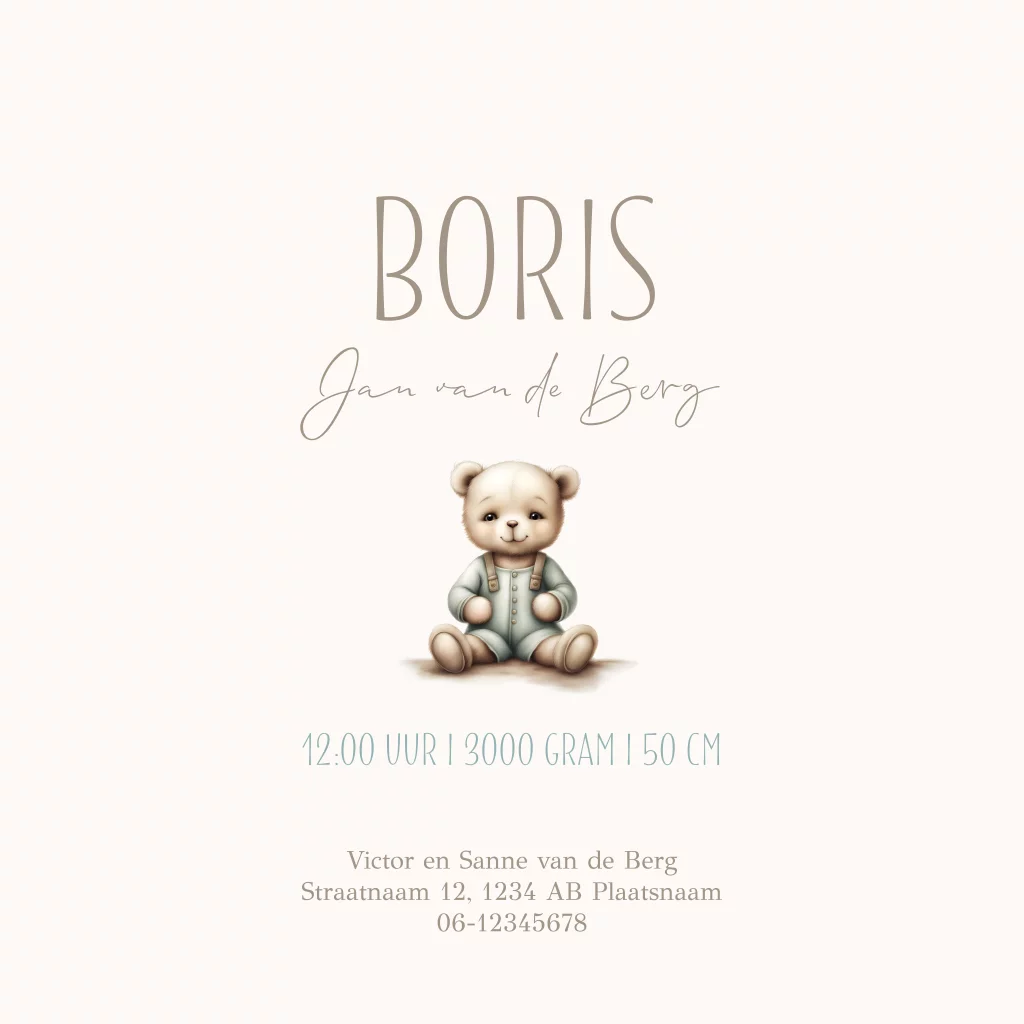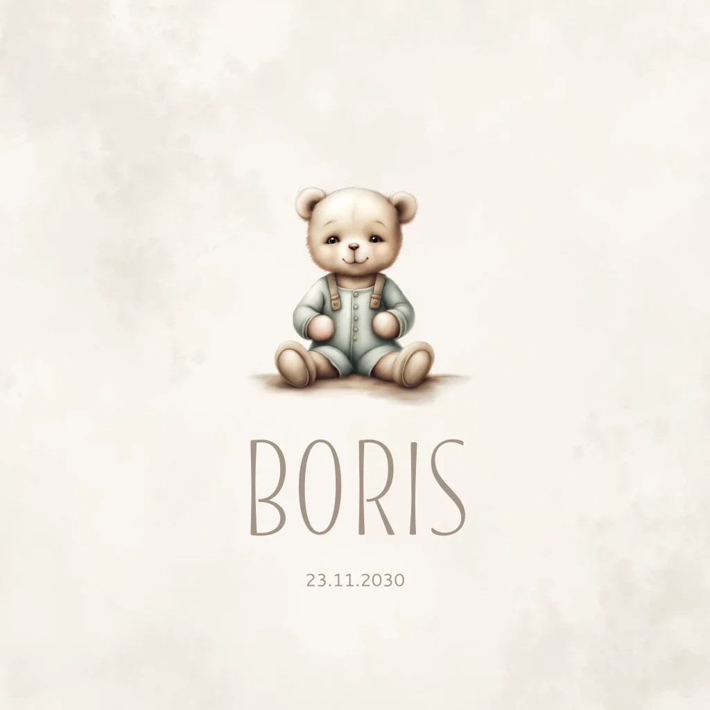 Welkom op deze wereld, lief kleintje! Dit geboortekaartje straalt zachtheid uit met een schattige illustratie van een op een beige ecru neutrale achtergrond. Het is de prachtig kaartje om de komst van jouw kleine wonder aan te kondigen. Maak zelf dit betoverende geboortekaartje voor een jongen en pas alles naar wens aan.