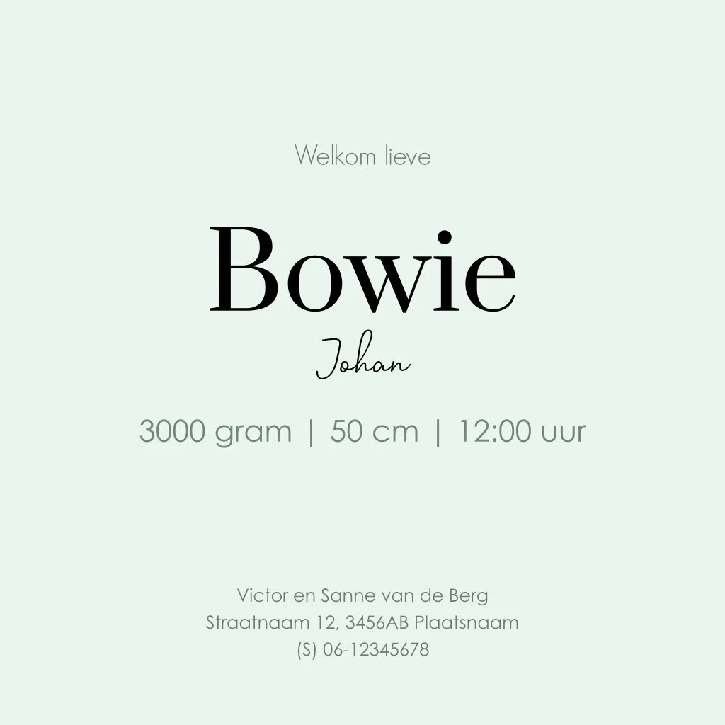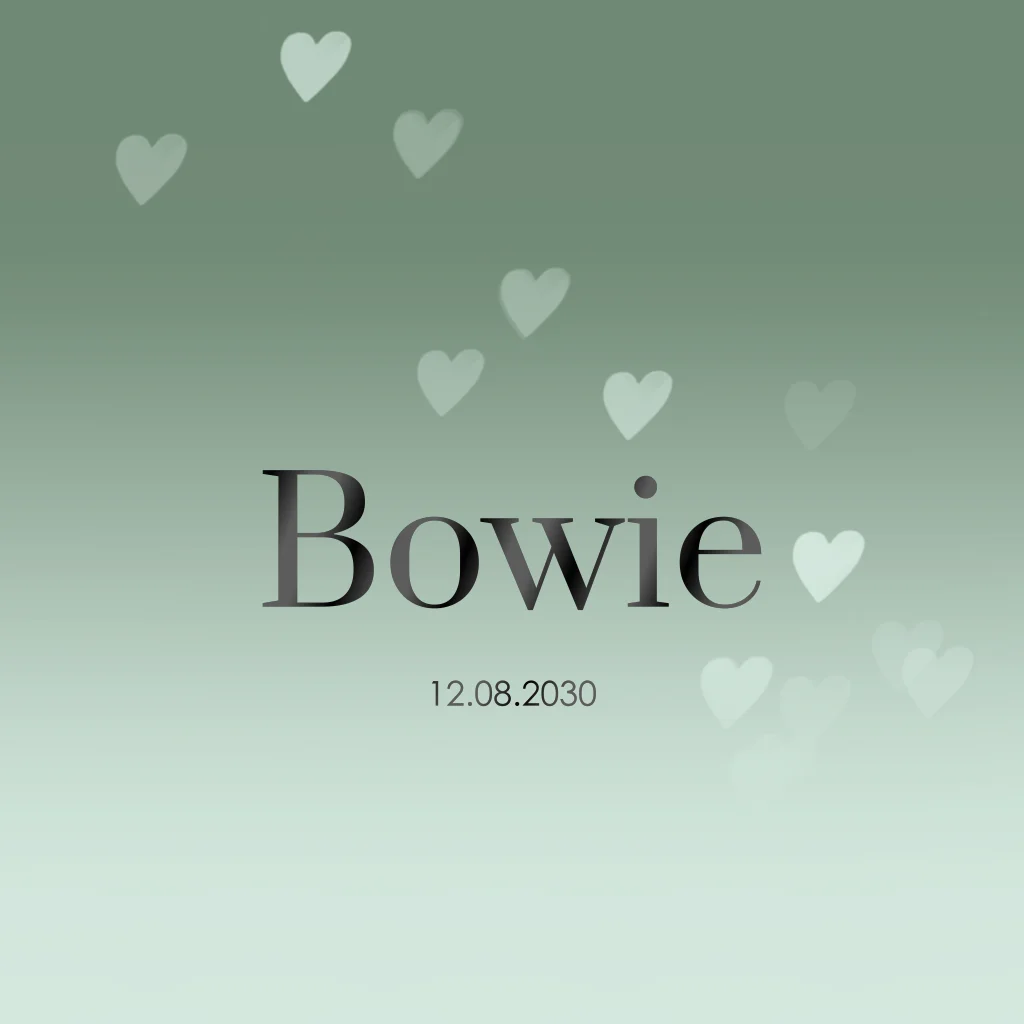 Dit geboortekaartje voor een jongen heeft een minimalistisch ontwerp met schattige kleine hartjes en de naam prominent in hoogglans zwart weergegeven. De achtergrond heeft een mooi kleurverloop van donker naar groen. Je kunt gemakkelijk de naam en kleuren aanpassen naar jouw smaak.