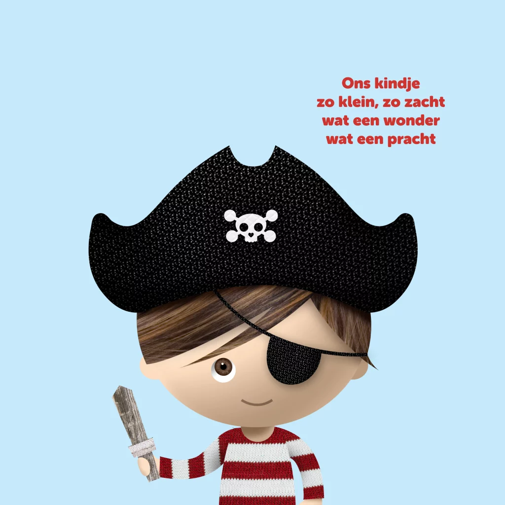 Dit stoere geboortekaartje van een piraat is helemaal de kaart voor je zoon. Een piraten hoedje en een ooglapje maken dit ventje super stoer. Het coole gestreepte truitje maakt hem helemaal af.