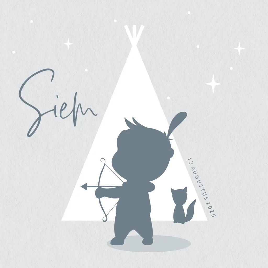 Lief geboortekaartje met silhouetten van een indiaantje met een wigwam en een klein vosje op een oker gele achtergrond met sterretjes. Maak dit schattige geboortekaartje bij Luckz.