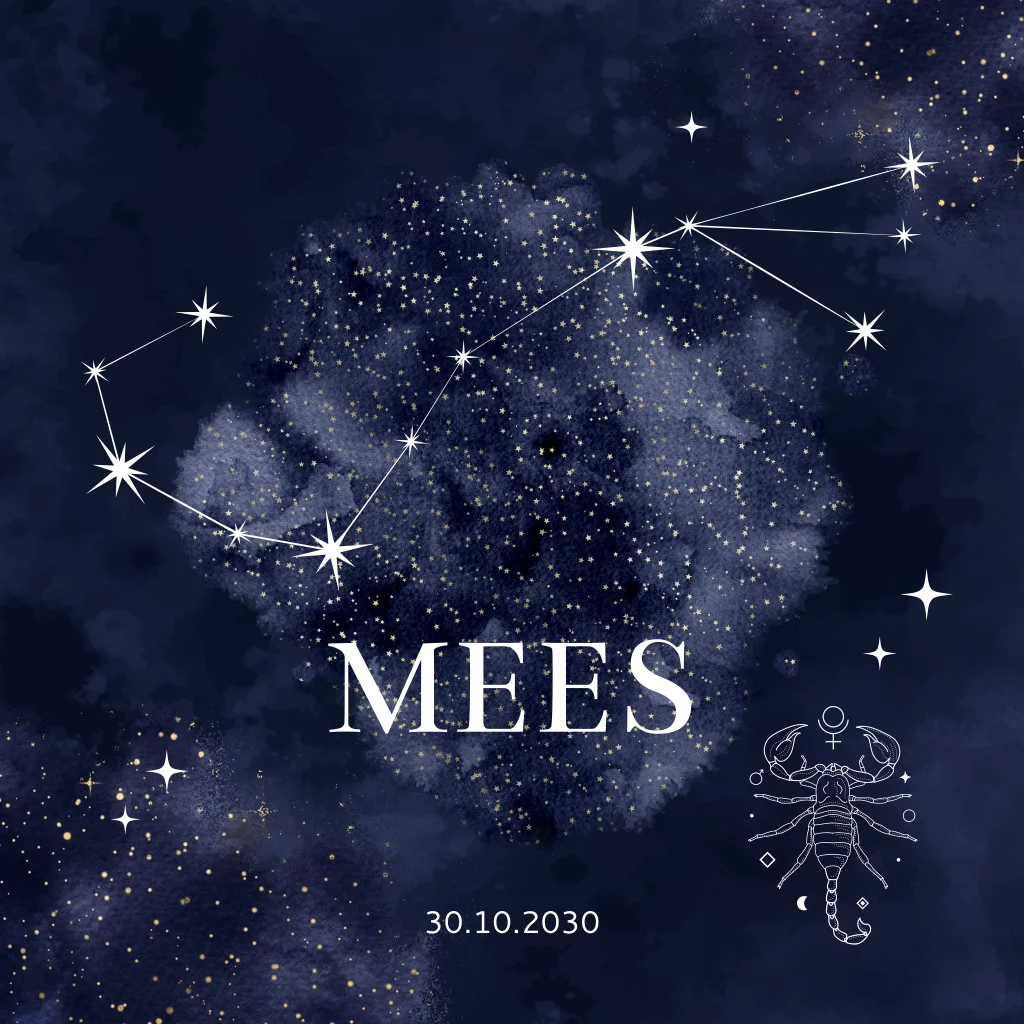 Dit mooie geboortekaartje is speciaal voor het sterrenbeeld Schorpioen, voor baby's met een verwachte geboortedatum tussen 24 oktober en 22 november. Ontdek onze prachtige geboortekaartjes met alle sterrenbeelden.