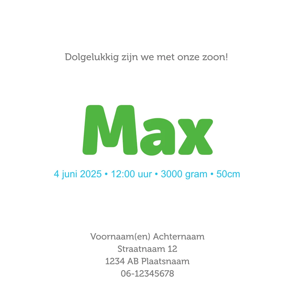 Een stoer geboortekaartje voor jouw zoon. Met zijn stoere kapsel en gestreepte truitje is dit een originele kaart voor je zoon. Aan de voorkant is plaats voor zijn naam en aan de binnenkant van de kaart staat het knappe ventje met een knuffel aapje in zijn hand. Er is plek voor een persoonlijke tekst aan de linkerkant van de kaart. Alle teksten zijn makkelijk aanpasbaar.