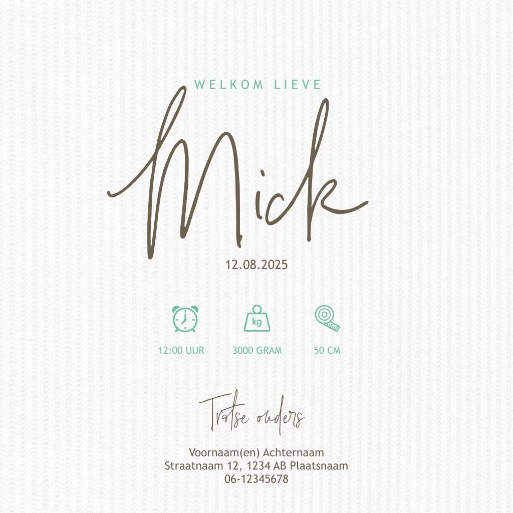 Dit mint groene vosje is lief, slim en heel schattig en is met leuke stof design elementen opgezet. De hippe typografie maken dit geboortekaartje helemaal af. Bewerk alle elementen en teksten met onze kaarten editor en ontwerp zelf deze originele geboortekaart die de komst van jullie zoontje aankondigt.