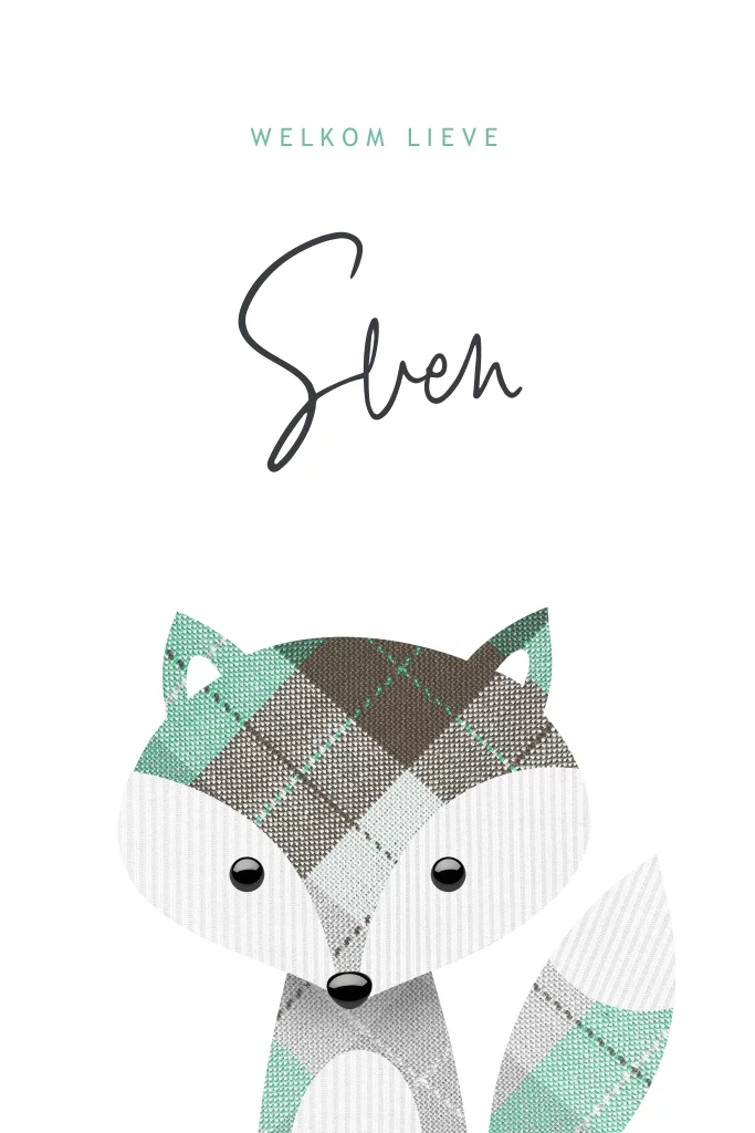 Maak dit leuke geboortekaartje met een lief en schattig vosje met mint groene met grijze kleuren op de voorkant. Het vosje heeft een uniek ontwerp van hippe stof effecten in een ruit patroon. Origineel geboortekaartje van Luckz.