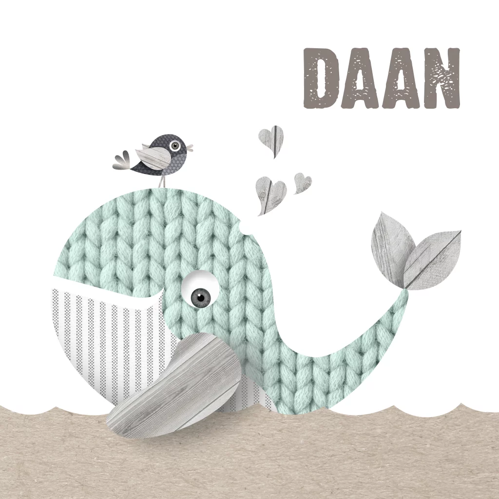 Lief dieren geboortekaartje voor een jongen, met hartjes een lief vogeltje en een grote pastel mint groene walvis. Hippe geboortekaartjes van Luckz.