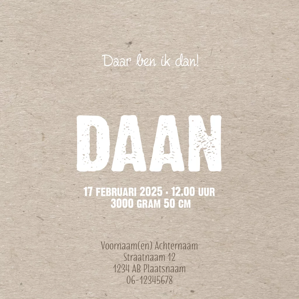 Aan de rechterzijde van het geboortekaartje staat de naam van de baby in het groot. Hier is ook plaats voor geboorte-informatie over de kleine of een leuke tekst of gedicht. Het is mogelijk om de tekst en kleuren aan de binnenzijde aan te passen.