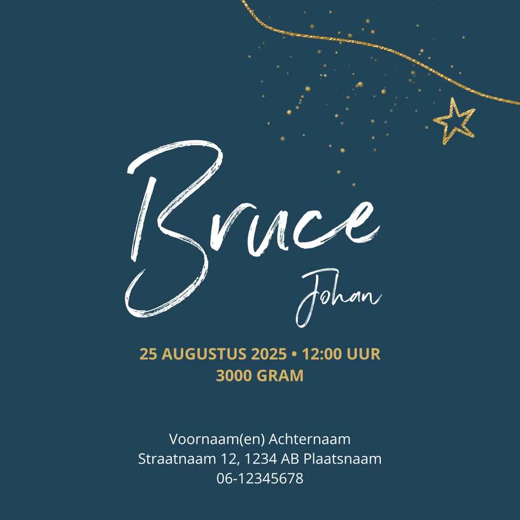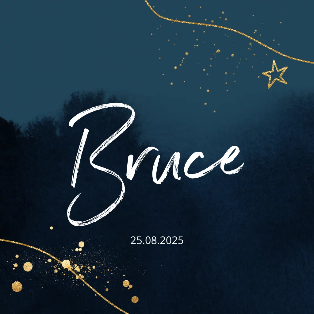 Ontwerp zelf dit chique geboortekaartje voor je zoontje met waterverf aquarel donkerblauwe ondergrond en goud look verfspetters en sierlijke lijnen.
