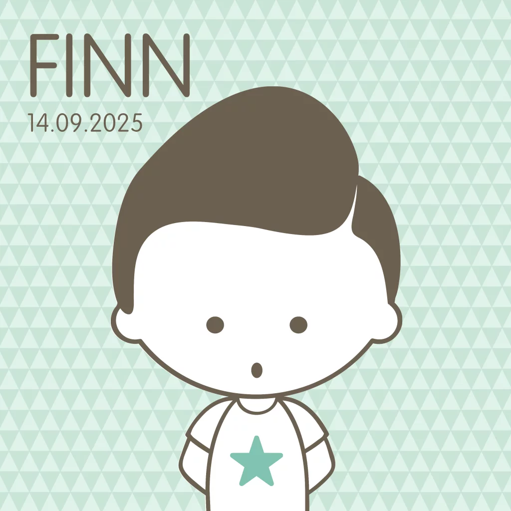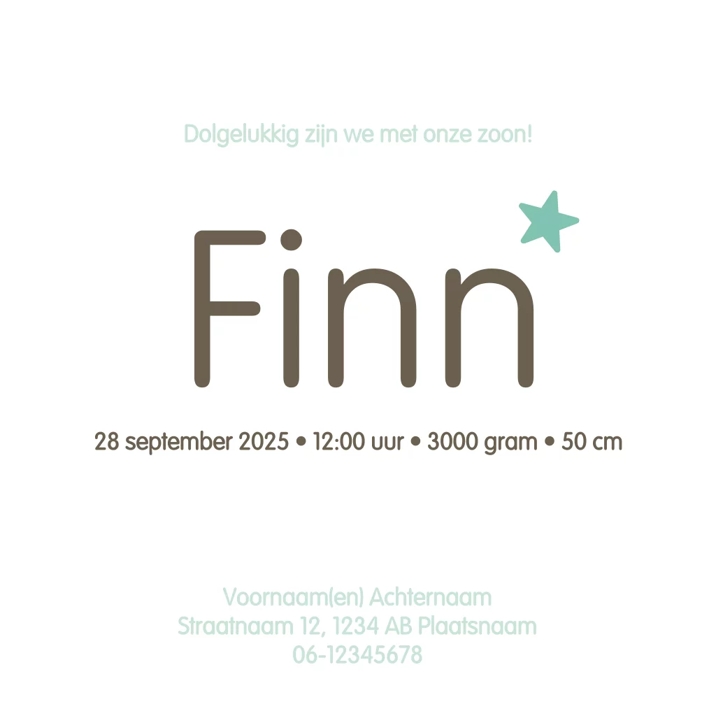 De kleine is aanstalten aan het maken, hoogste tijd om samen een leuk geboortekaartje te ontwerpen pas de kleuren gemakkelijk zelf aan. Hippe patronen in mint groen aan voor en achterzijde van het geboortekaartje. Grappige illustratie van een jongetje met hip T-shirtje en mint kleurige ster opdruk op de voorkant. Maak gebruik van de grote ster aan de binnenzijde voor een leuk geboortegedichtje.