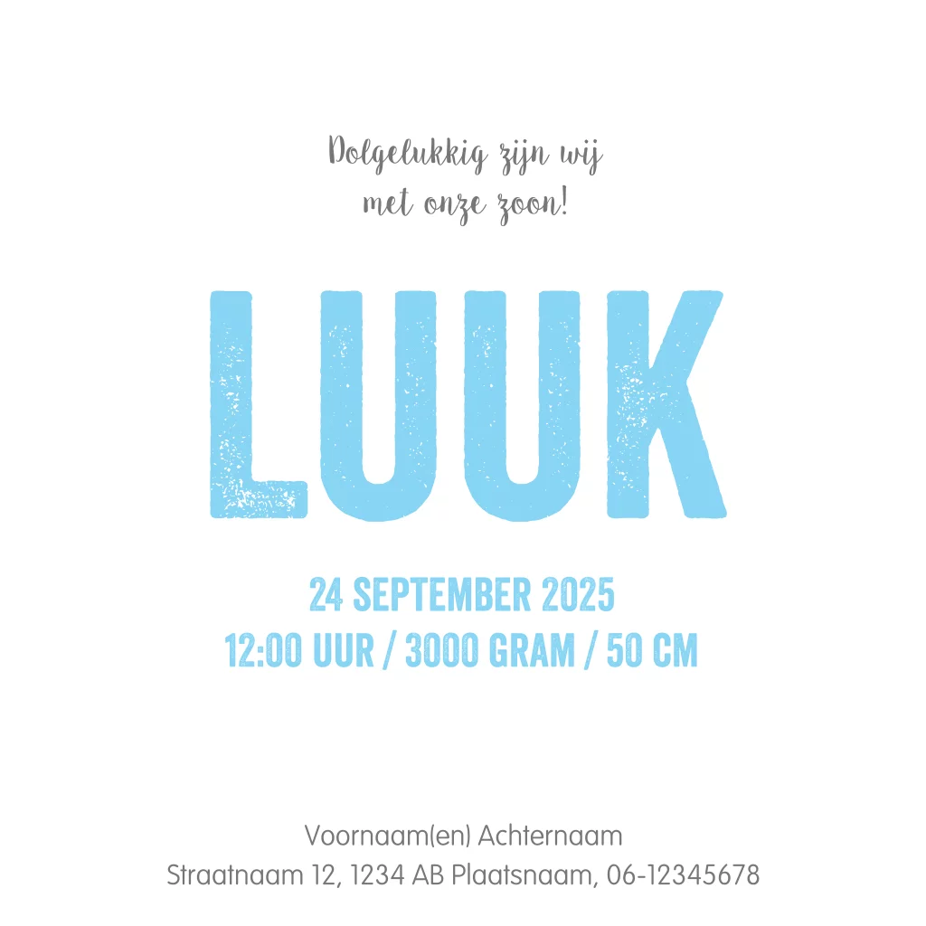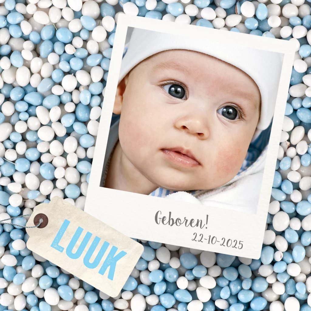 Origineel en vrolijk geboortekaartje met foto en blauwe muisjes. Hippe geboortekaartjes van Luckz.