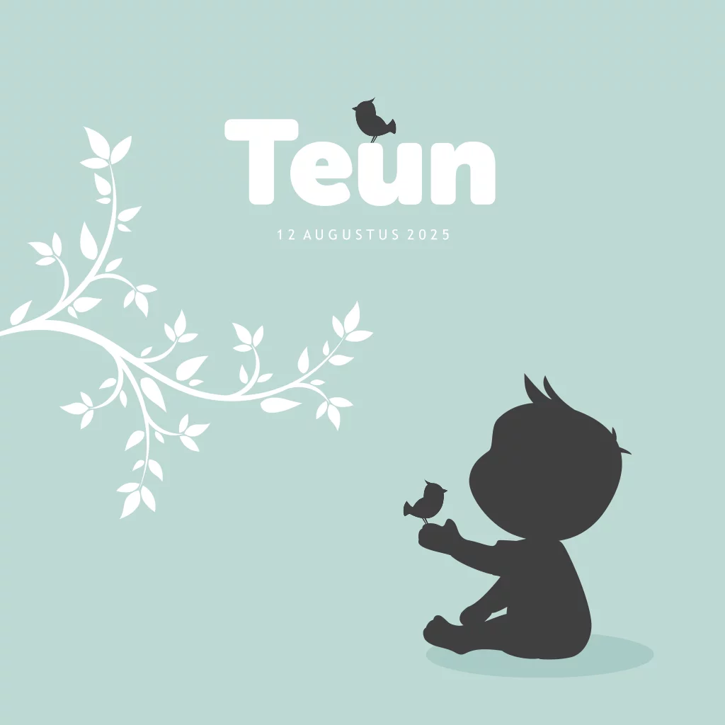Een lief geboortekaartje met een schattig silhouet van een jongetje met een schattig vogeltje en een mooie witte illustratieve tak op een oud blauwe achtergrond op de voorkant.