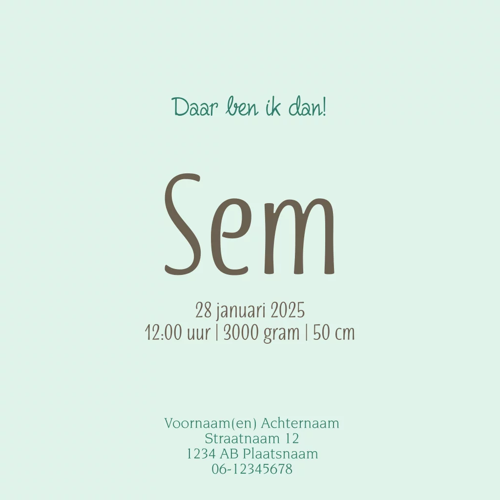 Laat iedereen weten dat jullie kleine jongen geboren is met dit hippe geboortekaartje met guitig uiltje op de voorkant. Plaats boven de uil de naam van jullie baby.