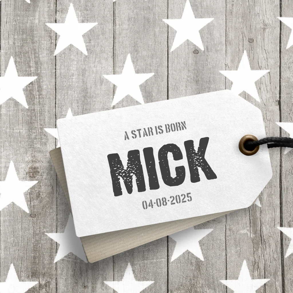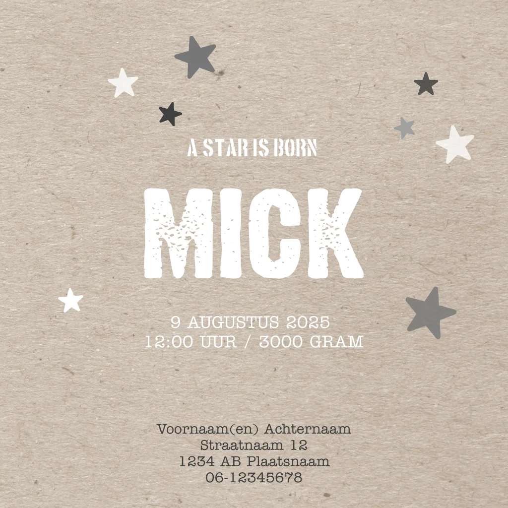 Modern en cool geboortekaartje voor jullie zoon. Stoere houten achtergrond met een groot wit label waar de naam van jullie kleine man in kan. De karton look aan de binnenkant geeft deze kaart een stoere uitstraling. Je kunt de tekst, datum en naam makkelijk aan passen met de editor.