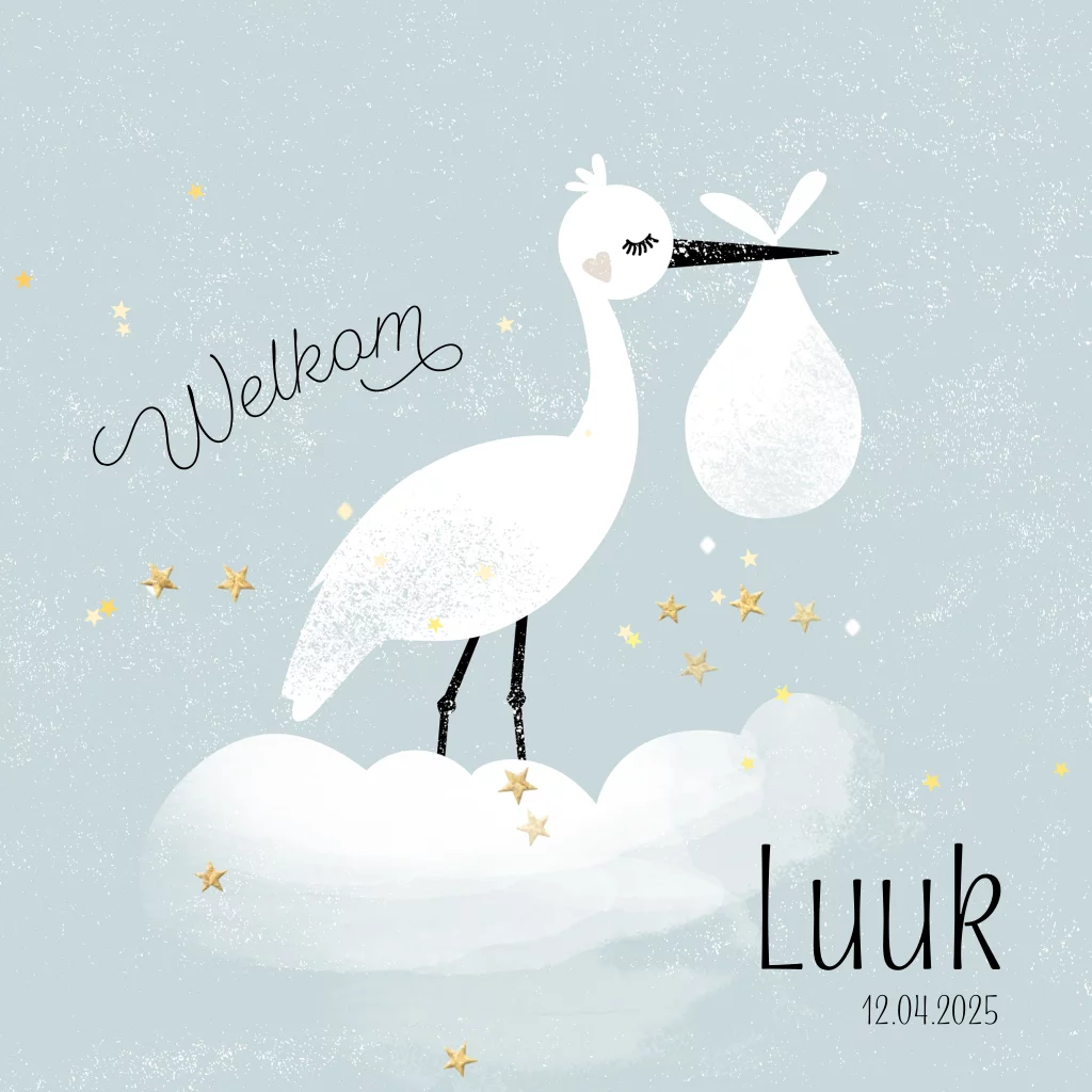 Schattig geboortekaartje voor een jongetje met een ooievaar op een wolk. Met gouden sterretjes op een achtergrond van grijs blauw.