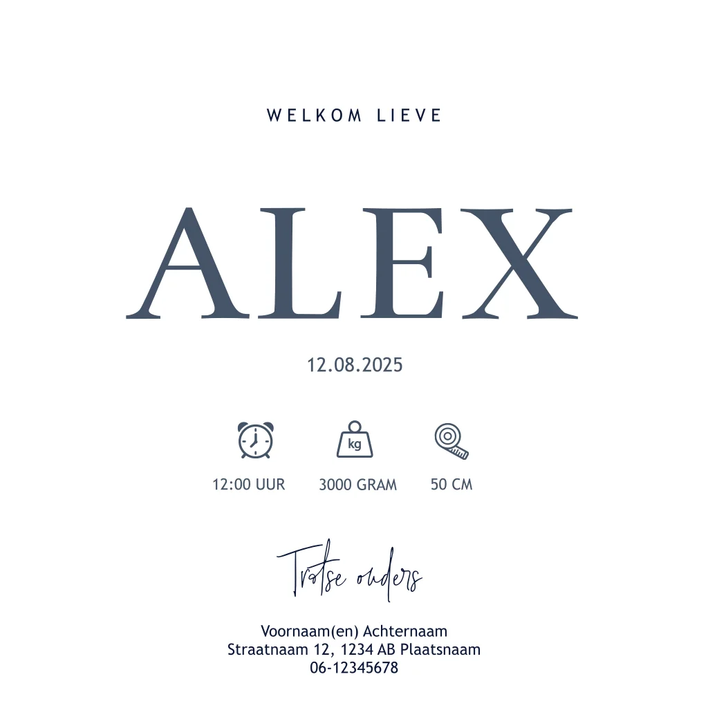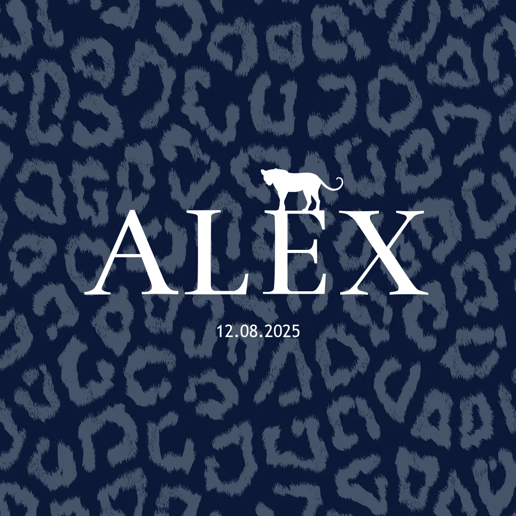 Stoer dierenprint geboortekaartje met een panter patroon in donker blauwe tinten, alle kleuren kun je zelf helemaal aanpassen. Maak zelf dit hippe geboortekaartje met dieren print in je eigen favoriete kleuren bij Luckz.