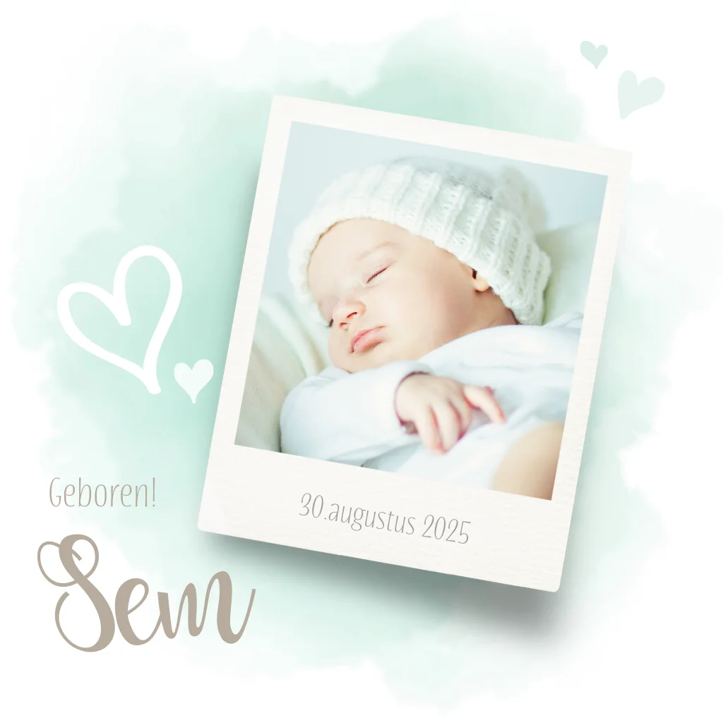 Maak zelf dit aquarel groene geboortekaartje voor de geboorte van jullie baby. Zet een zelfgemaakte foto op de voorkant. Kleine hartjes en natuurlijk de naam van jullie baby.