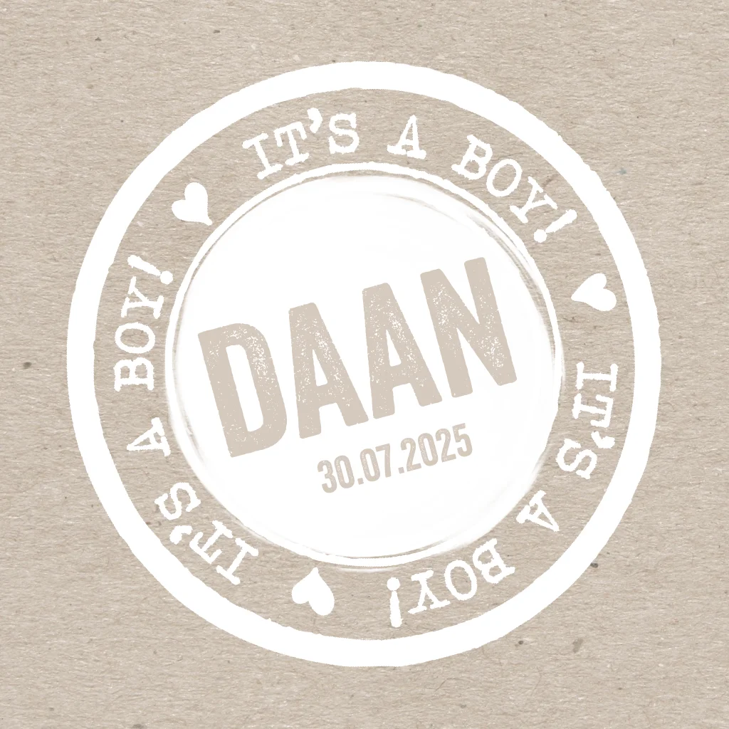 Hip geboortekaartje met stoere karton look, witte stempel en label. Stoer geboortekaartje van Luckz.
