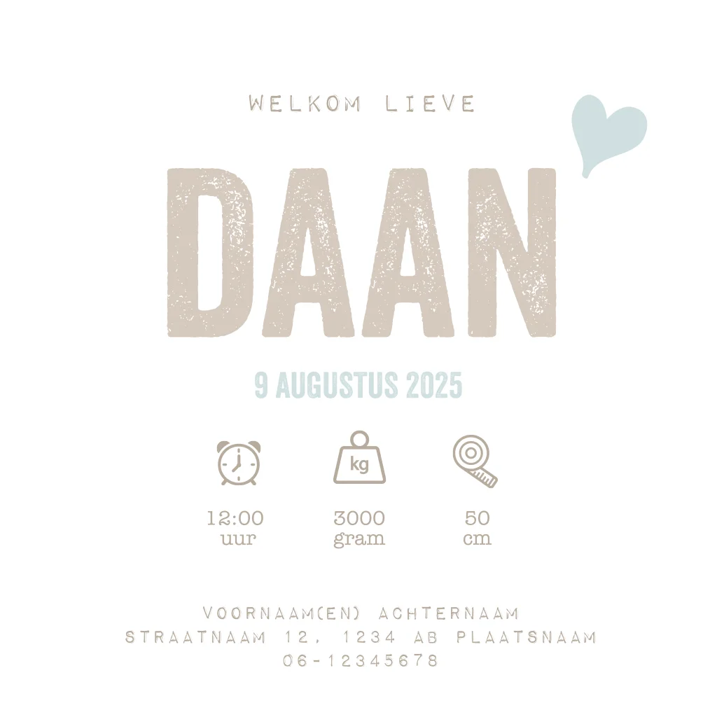 De hippe witte stempel met de tekst "It's a boy" op de karton look achtergrond is de perfecte plaats voor de naam van jullie zoontje. Schrijf een lief gedichtje over de kleine jongen en plaats deze op het label aan de binnenzijde van het geboortekaartje. Maak gebruik van de linker binnenzijde van de babykaart om baby informatie te plaatsen en natuurlijk de naam van jullie pasgeboren mannetje.