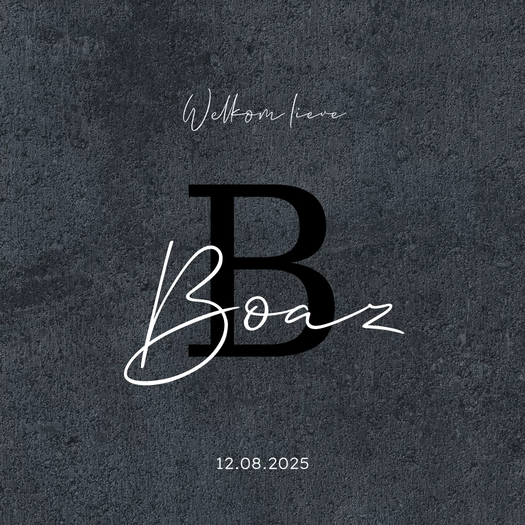 Een stoer geboortekaartje voor een stoere jongen. Met groot in goudfolie de naam, met groot het initiaal op de voorkant en stoer donker grijs beton look ondergrondje.