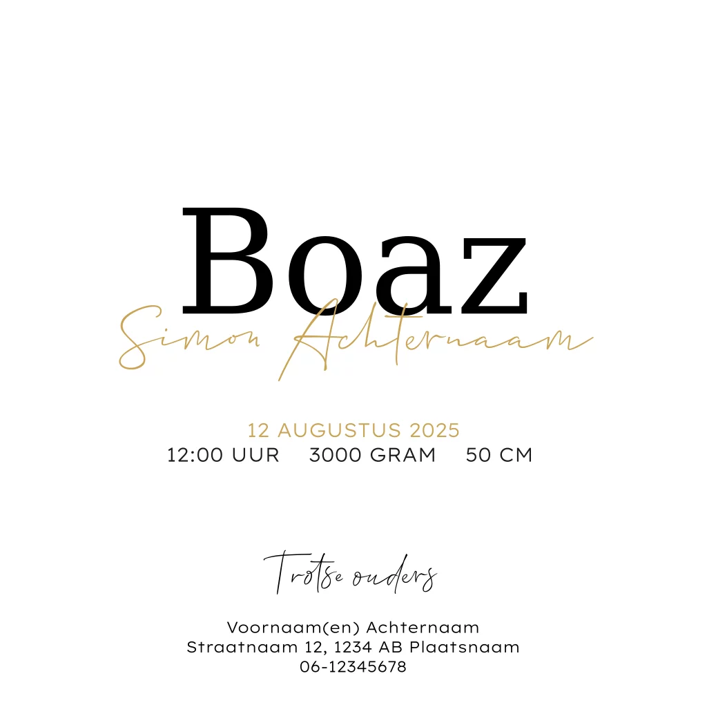 Stoer geboortekaartje goudfolie voor een jongen