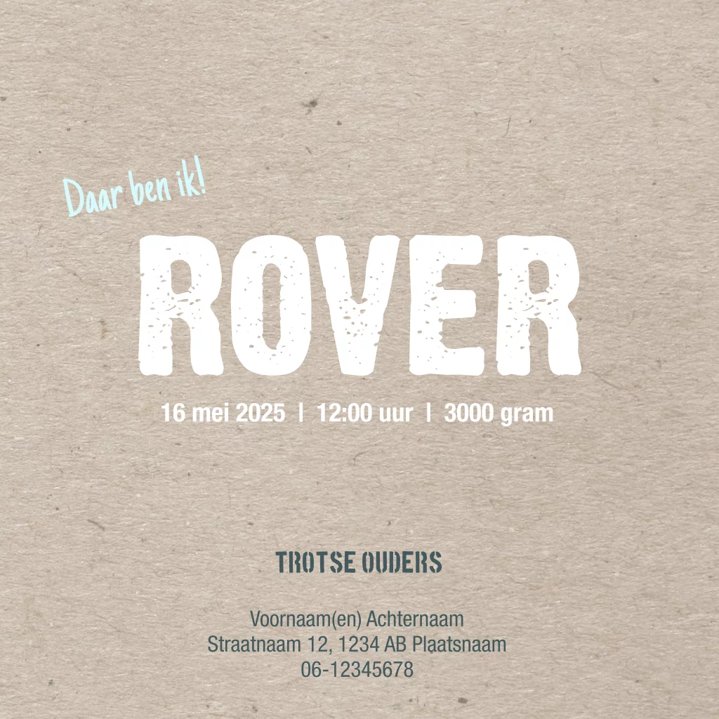 De binnenzijde van het geboortekaartje heeft een kartonnen look, met links een groot label waar je een lief geboortegedichtje of tekst in kan schrijven. Aan de rechterzijde staat in het groot de naam van jullie nieuwe aanwinst. Hier is genoeg ruimte om zelf een originele geboortetekst toe te voegen. Je kunt de kleur en tekst naar eigen smaak aanpassen aan de binnenzijde van je stoere geboortekaartjes.