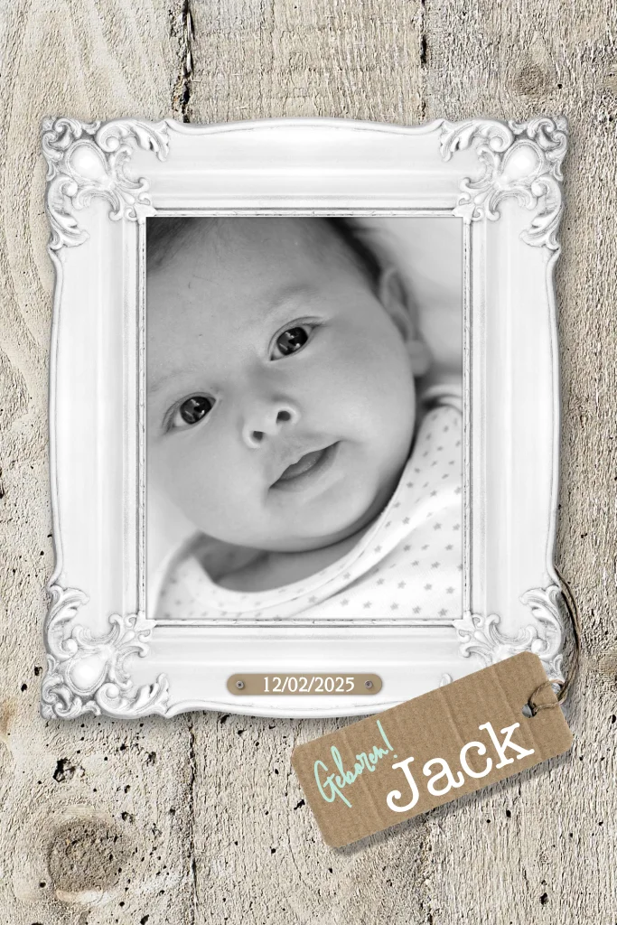 Dit stoere geboortekaartje heeft een wit fotolijstje op de voorkant met daarin een schattige foto van je pasgeboren zoon. Je kan alle geboortetekst, naam en foto zelf aanpassen. Alle kleuren kun je ook roze maken voor een meisje.