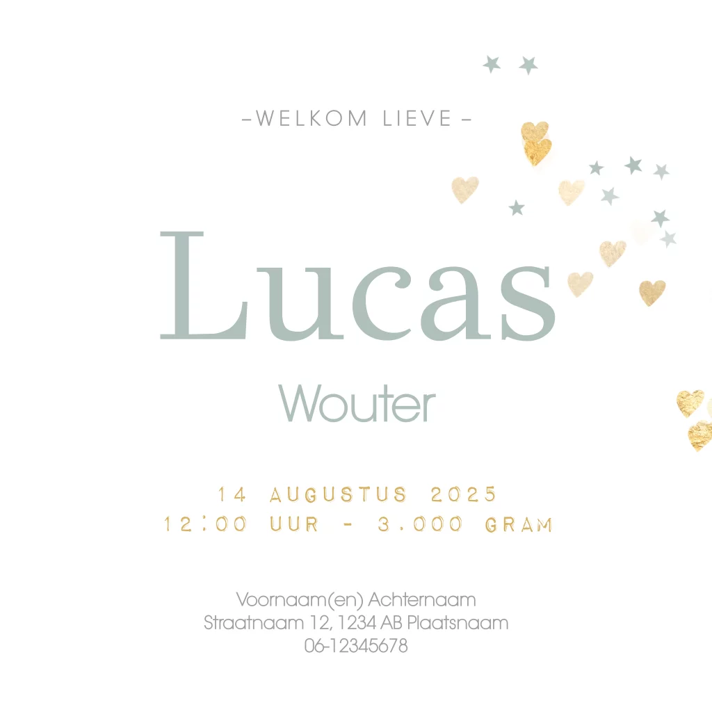 Trendy geboortekaart voor een jongen met hartjes van goud op een achtergrond in de kleur grijs groen. Moderne geboortekaartjes van Luckz.